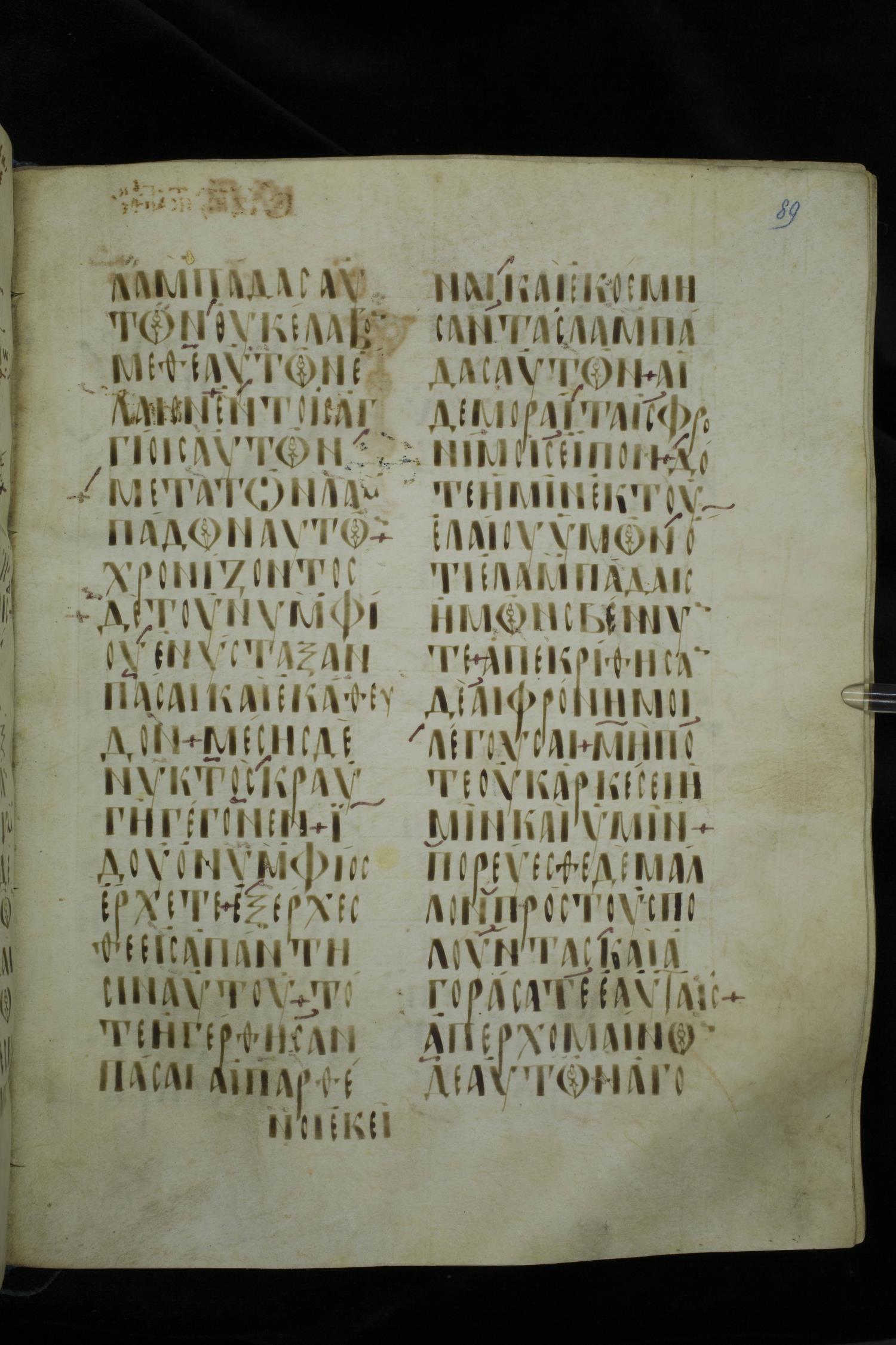 Ninth or tenth century majuscule lectionary on parchment; 273 leaves, 2 columns, 20-21 lines per column. Images were taken at the National Library of Greece in Athens.
