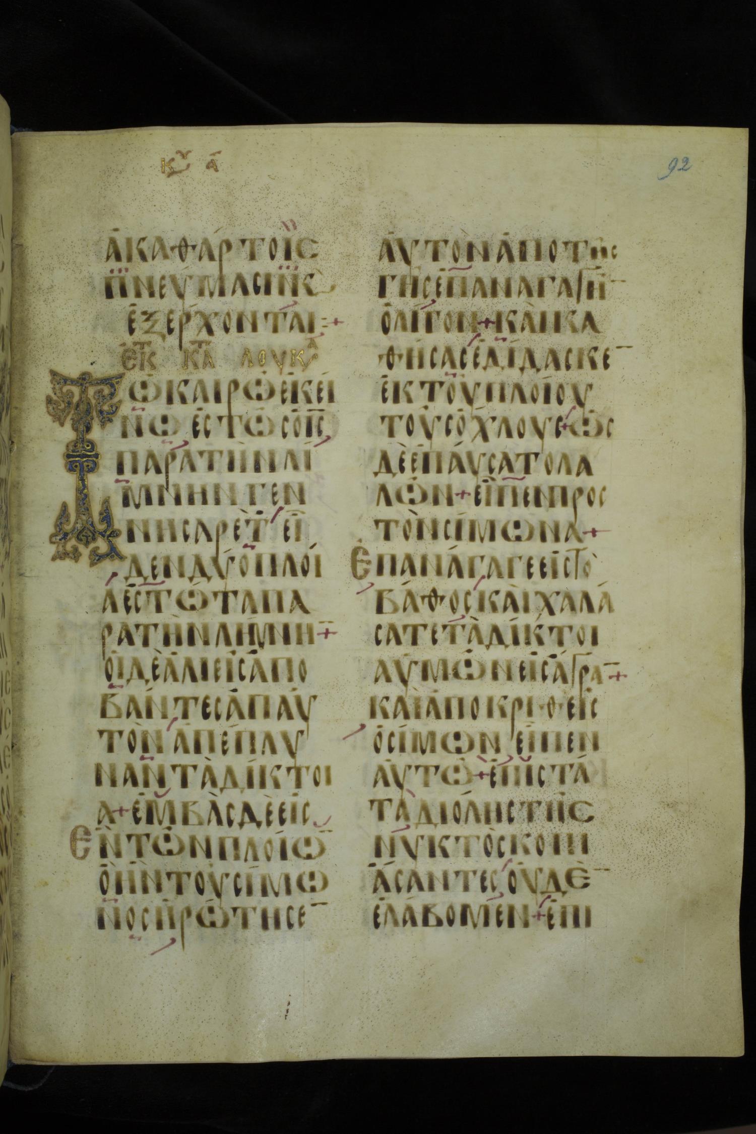 Ninth or tenth century majuscule lectionary on parchment; 273 leaves, 2 columns, 20-21 lines per column. Images were taken at the National Library of Greece in Athens.