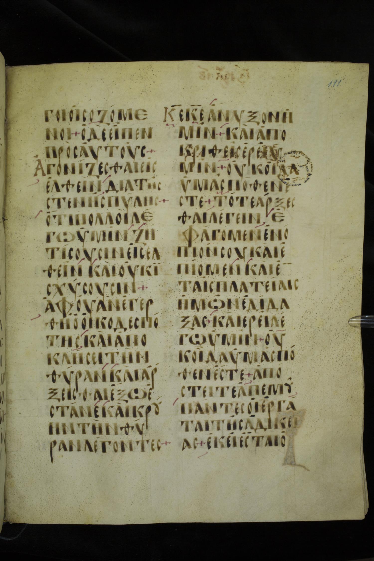 Ninth or tenth century majuscule lectionary on parchment; 273 leaves, 2 columns, 20-21 lines per column. Images were taken at the National Library of Greece in Athens.