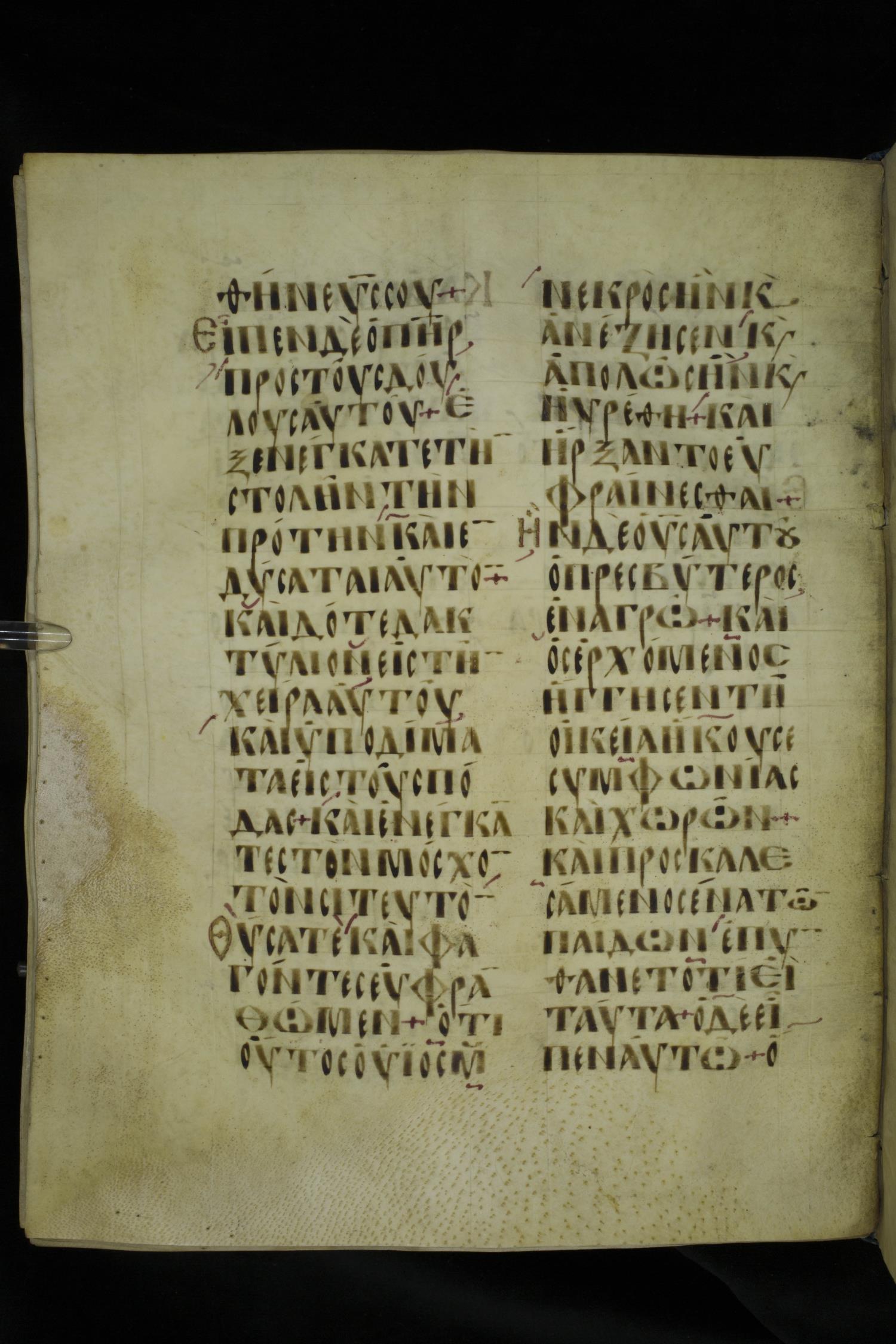 Ninth or tenth century majuscule lectionary on parchment; 273 leaves, 2 columns, 20-21 lines per column. Images were taken at the National Library of Greece in Athens.