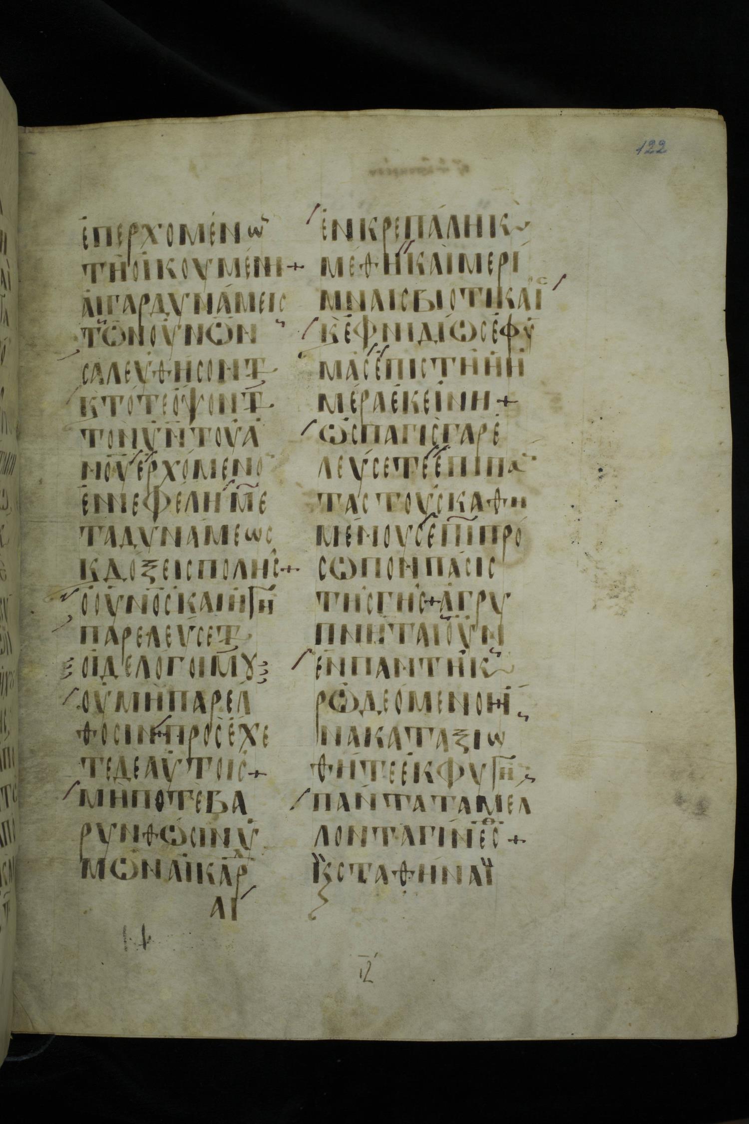Ninth or tenth century majuscule lectionary on parchment; 273 leaves, 2 columns, 20-21 lines per column. Images were taken at the National Library of Greece in Athens.
