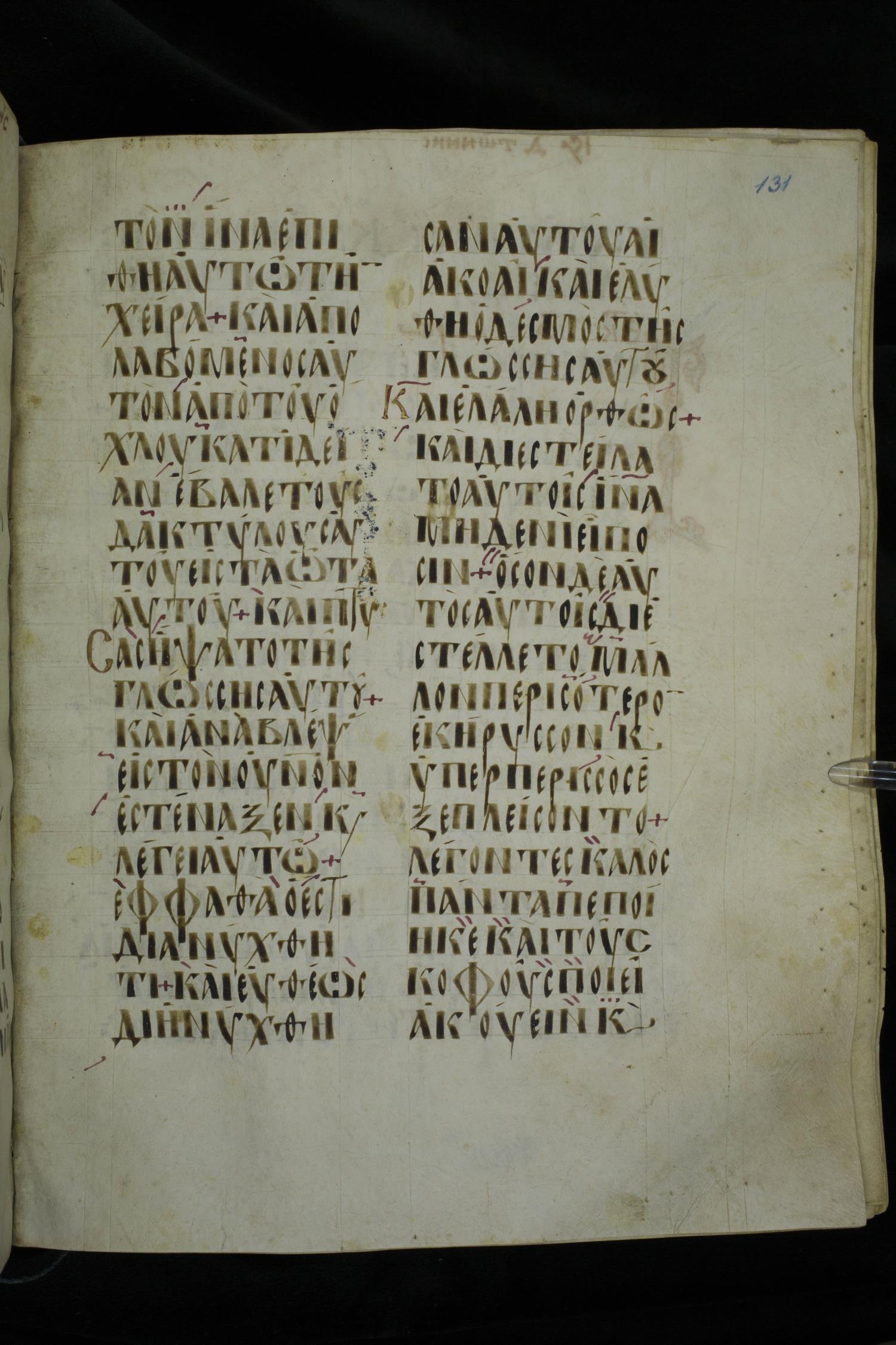 Ninth or tenth century majuscule lectionary on parchment; 273 leaves, 2 columns, 20-21 lines per column. Images were taken at the National Library of Greece in Athens.