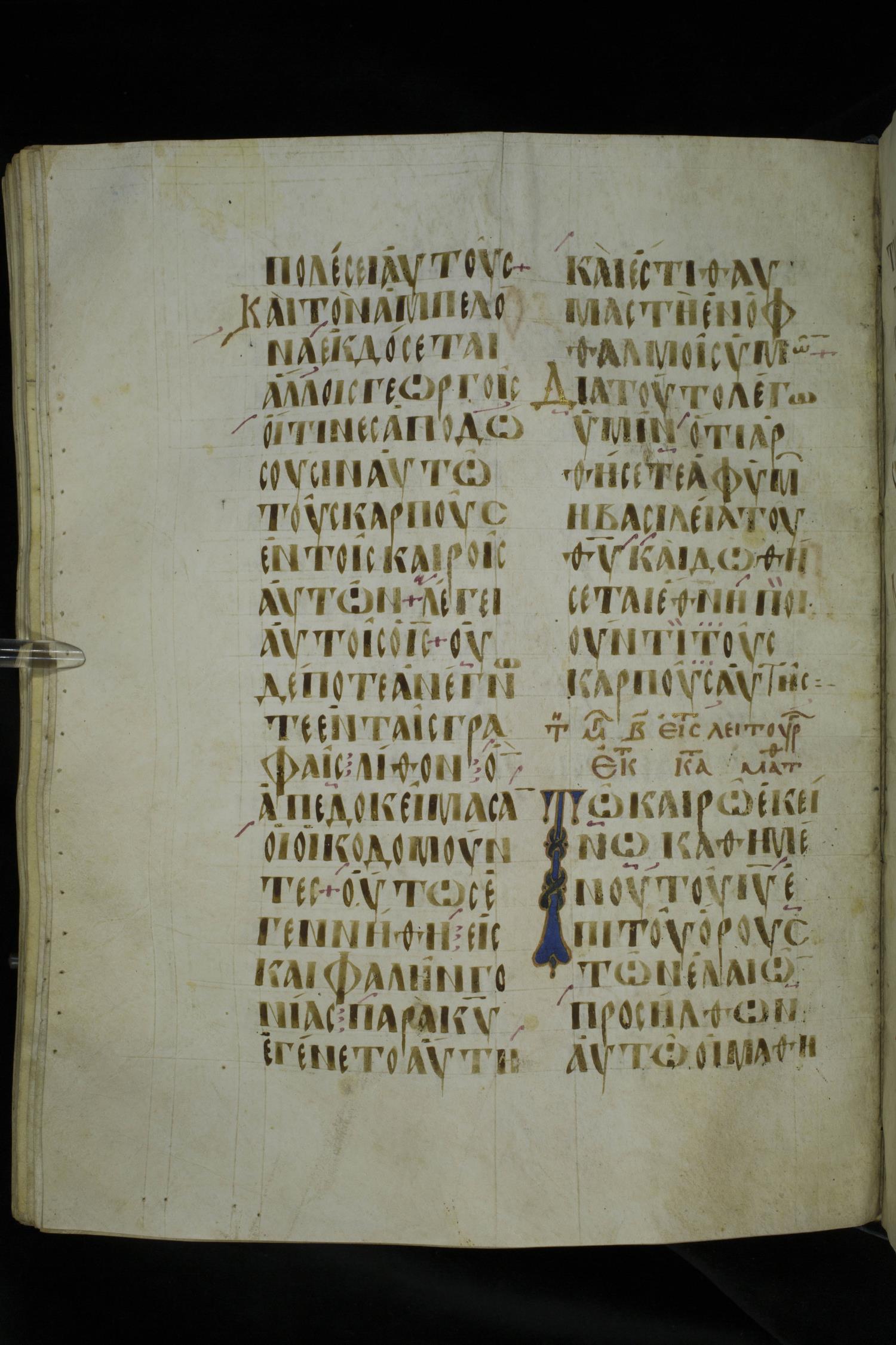 Ninth or tenth century majuscule lectionary on parchment; 273 leaves, 2 columns, 20-21 lines per column. Images were taken at the National Library of Greece in Athens.
