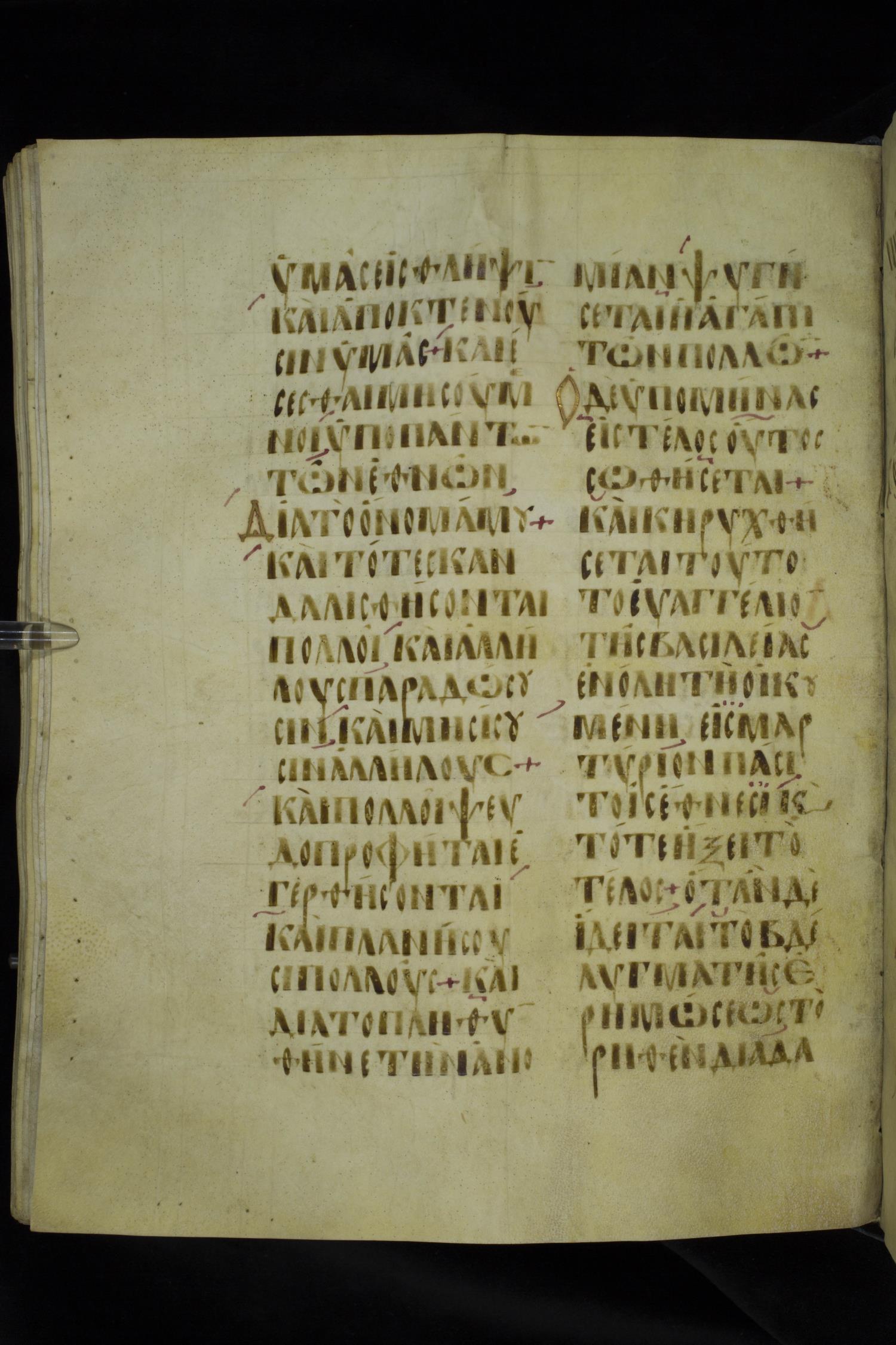 Ninth or tenth century majuscule lectionary on parchment; 273 leaves, 2 columns, 20-21 lines per column. Images were taken at the National Library of Greece in Athens.