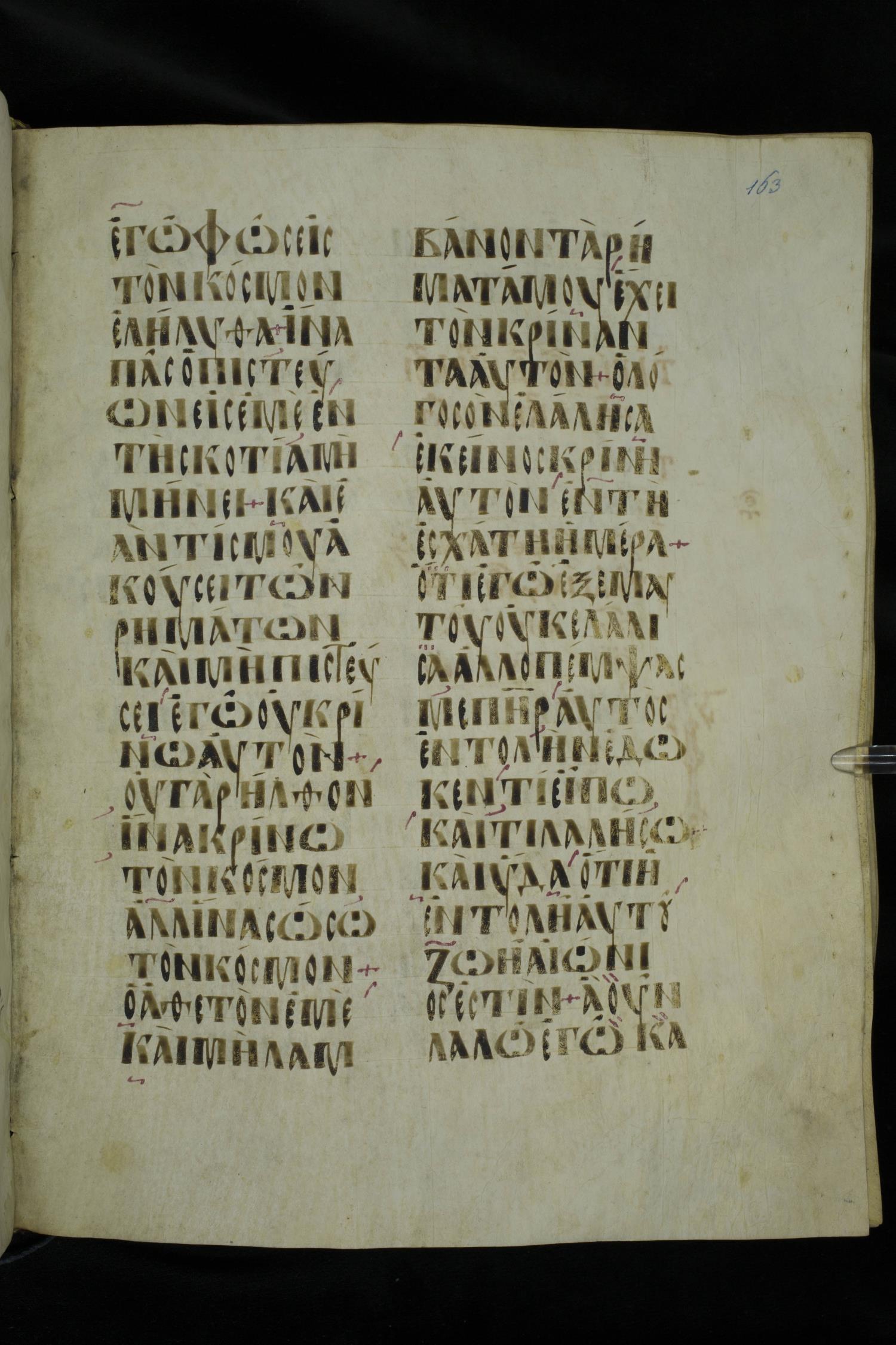 Ninth or tenth century majuscule lectionary on parchment; 273 leaves, 2 columns, 20-21 lines per column. Images were taken at the National Library of Greece in Athens.