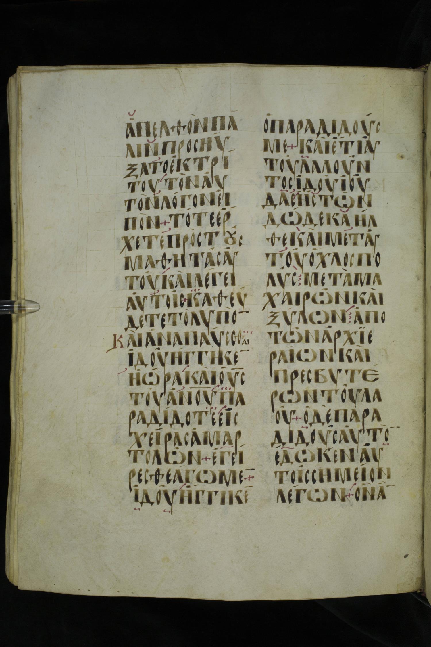 Ninth or tenth century majuscule lectionary on parchment; 273 leaves, 2 columns, 20-21 lines per column. Images were taken at the National Library of Greece in Athens.