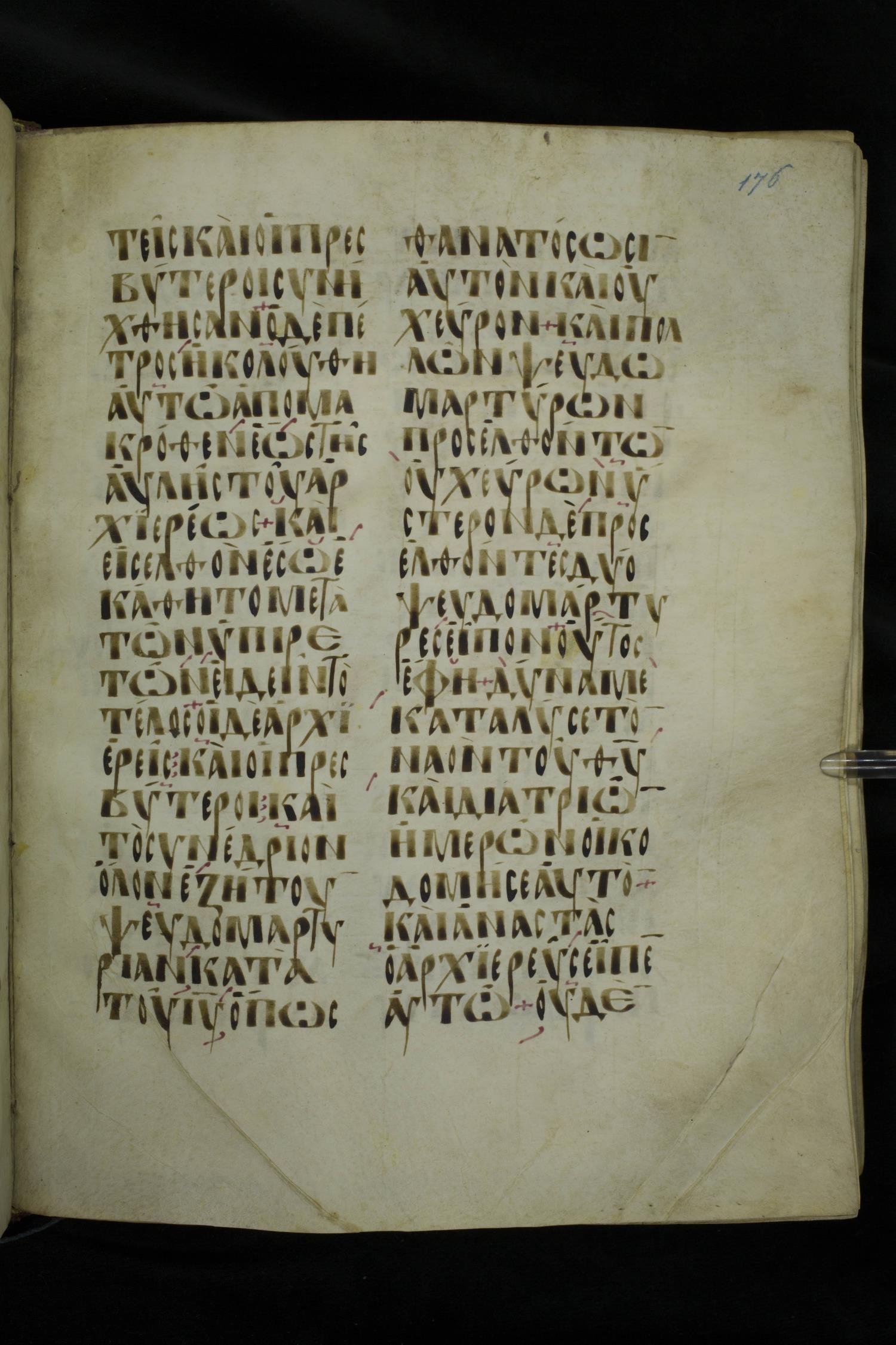 Ninth or tenth century majuscule lectionary on parchment; 273 leaves, 2 columns, 20-21 lines per column. Images were taken at the National Library of Greece in Athens.