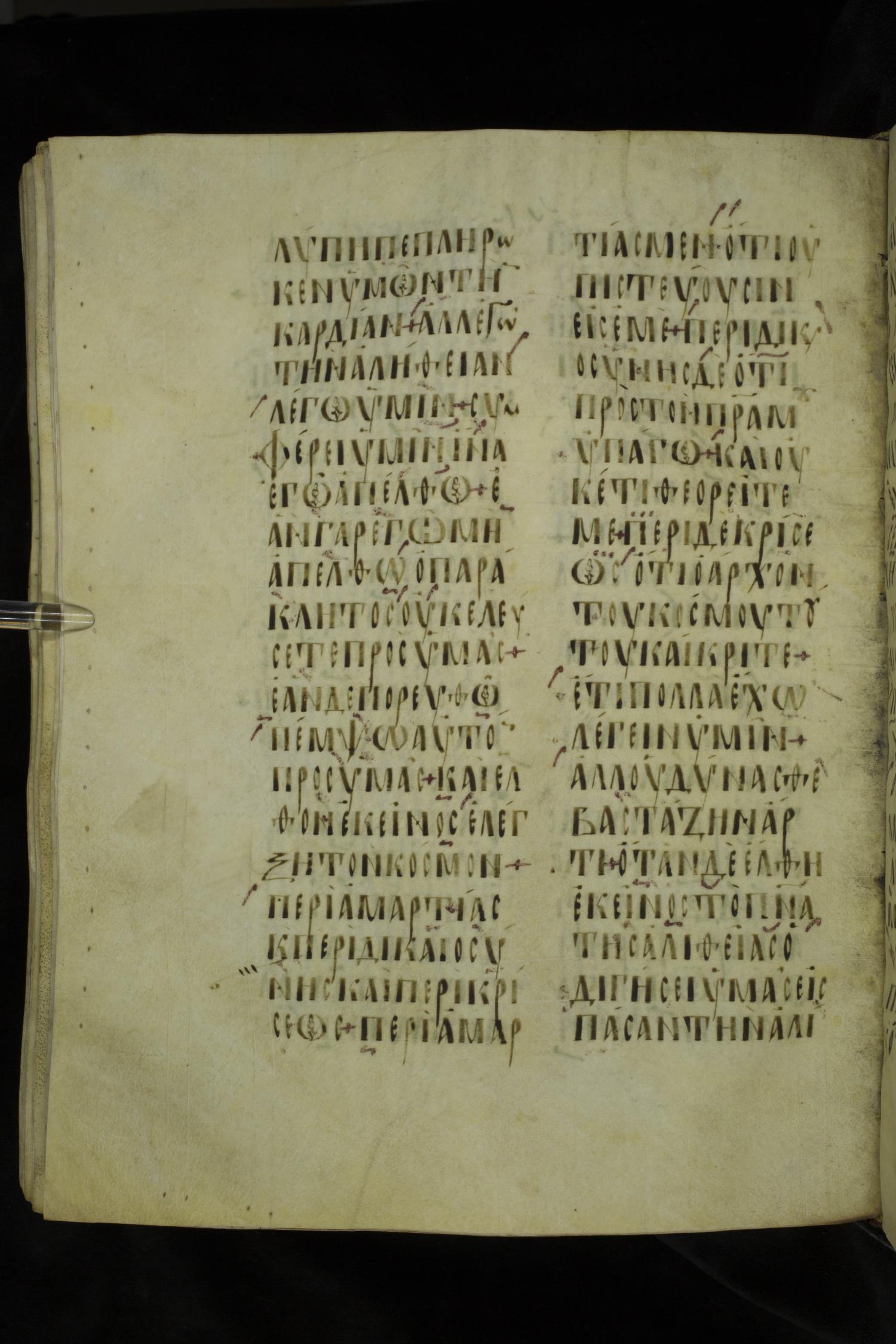 Ninth or tenth century majuscule lectionary on parchment; 273 leaves, 2 columns, 20-21 lines per column. Images were taken at the National Library of Greece in Athens.