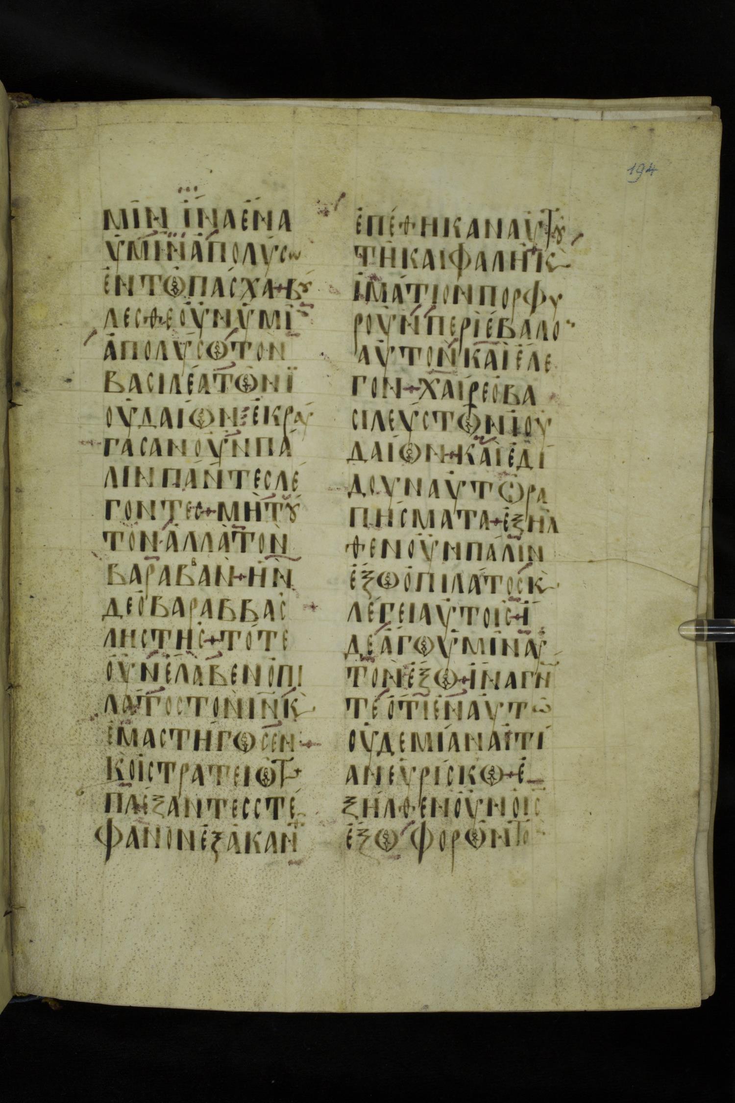 Ninth or tenth century majuscule lectionary on parchment; 273 leaves, 2 columns, 20-21 lines per column. Images were taken at the National Library of Greece in Athens.