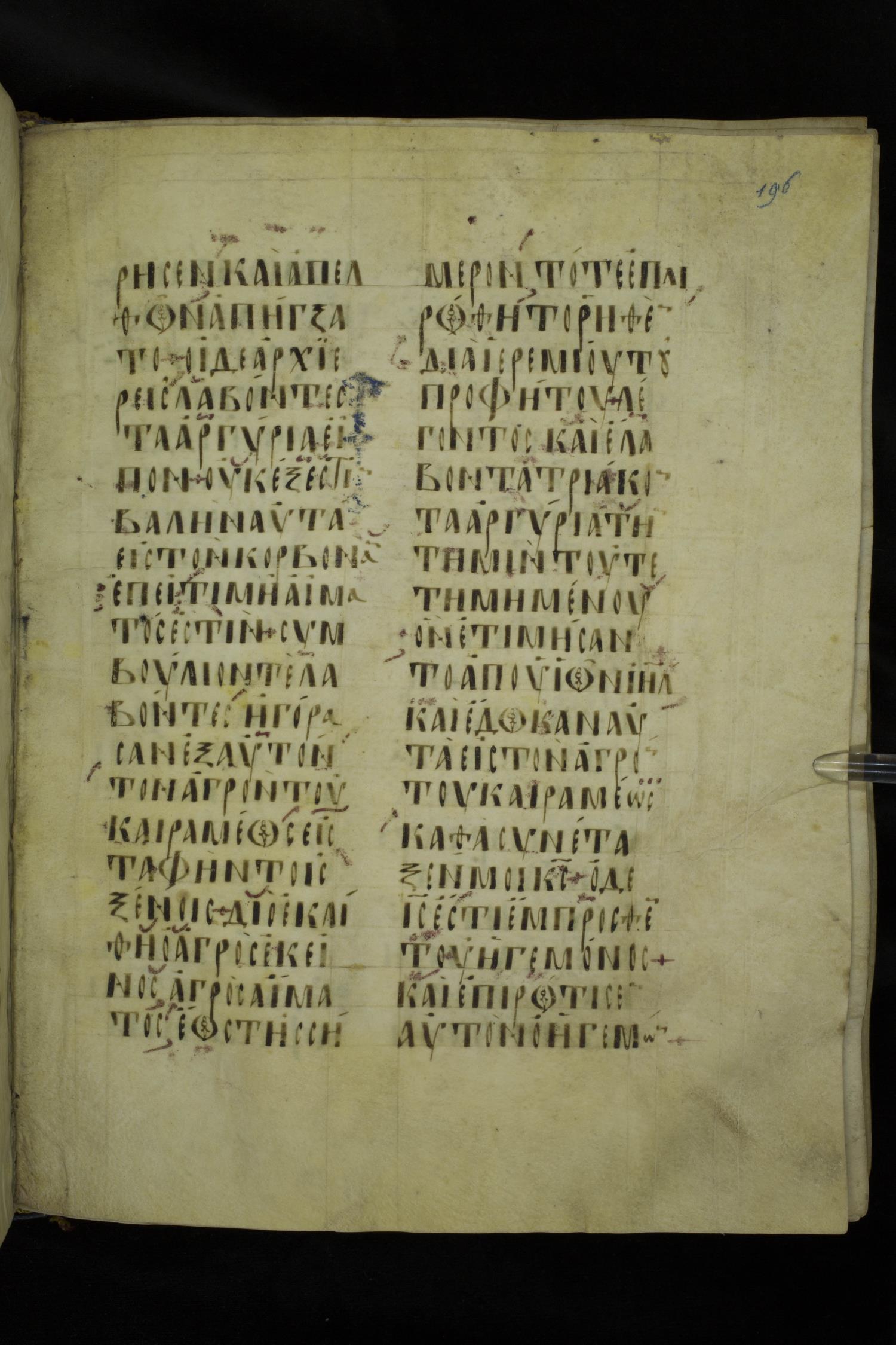 Ninth or tenth century majuscule lectionary on parchment; 273 leaves, 2 columns, 20-21 lines per column. Images were taken at the National Library of Greece in Athens.