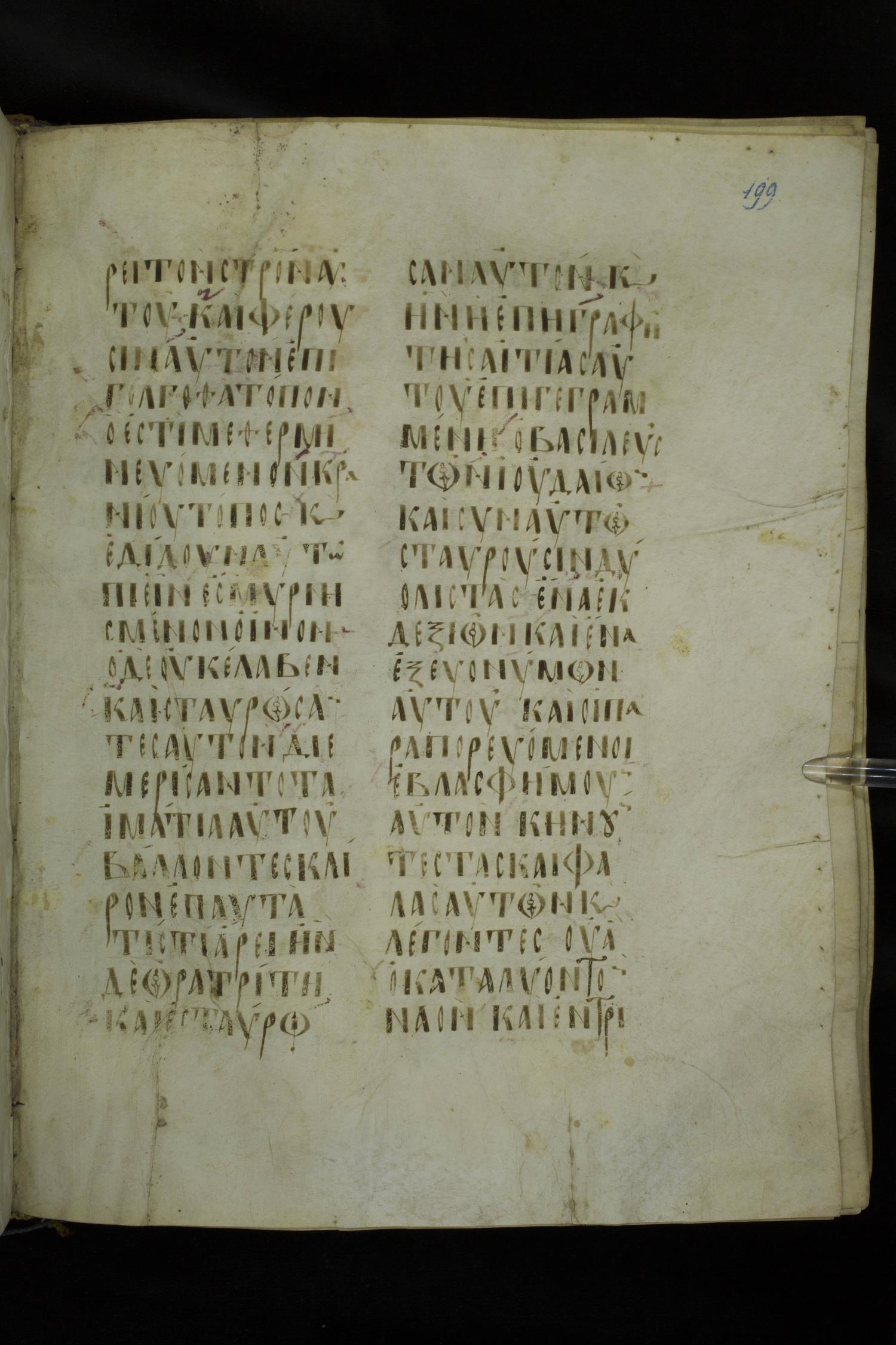 Ninth or tenth century majuscule lectionary on parchment; 273 leaves, 2 columns, 20-21 lines per column. Images were taken at the National Library of Greece in Athens.