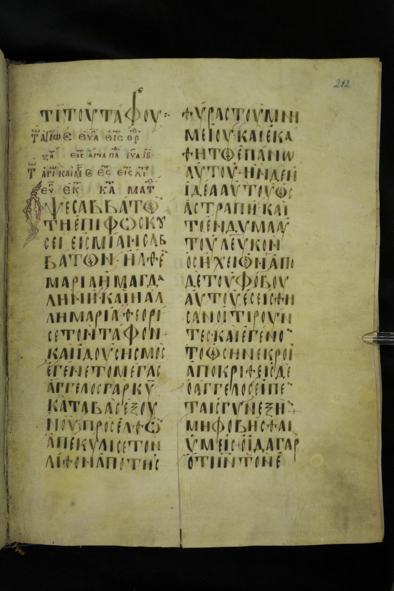 Ninth or tenth century majuscule lectionary on parchment; 273 leaves, 2 columns, 20-21 lines per column. Images were taken at the National Library of Greece in Athens.