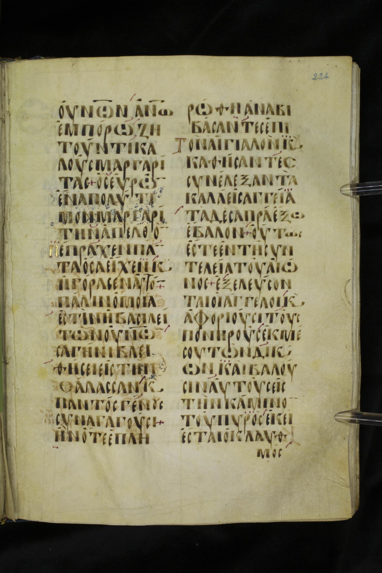 Ninth or tenth century majuscule lectionary on parchment; 273 leaves, 2 columns, 20-21 lines per column. Images were taken at the National Library of Greece in Athens.