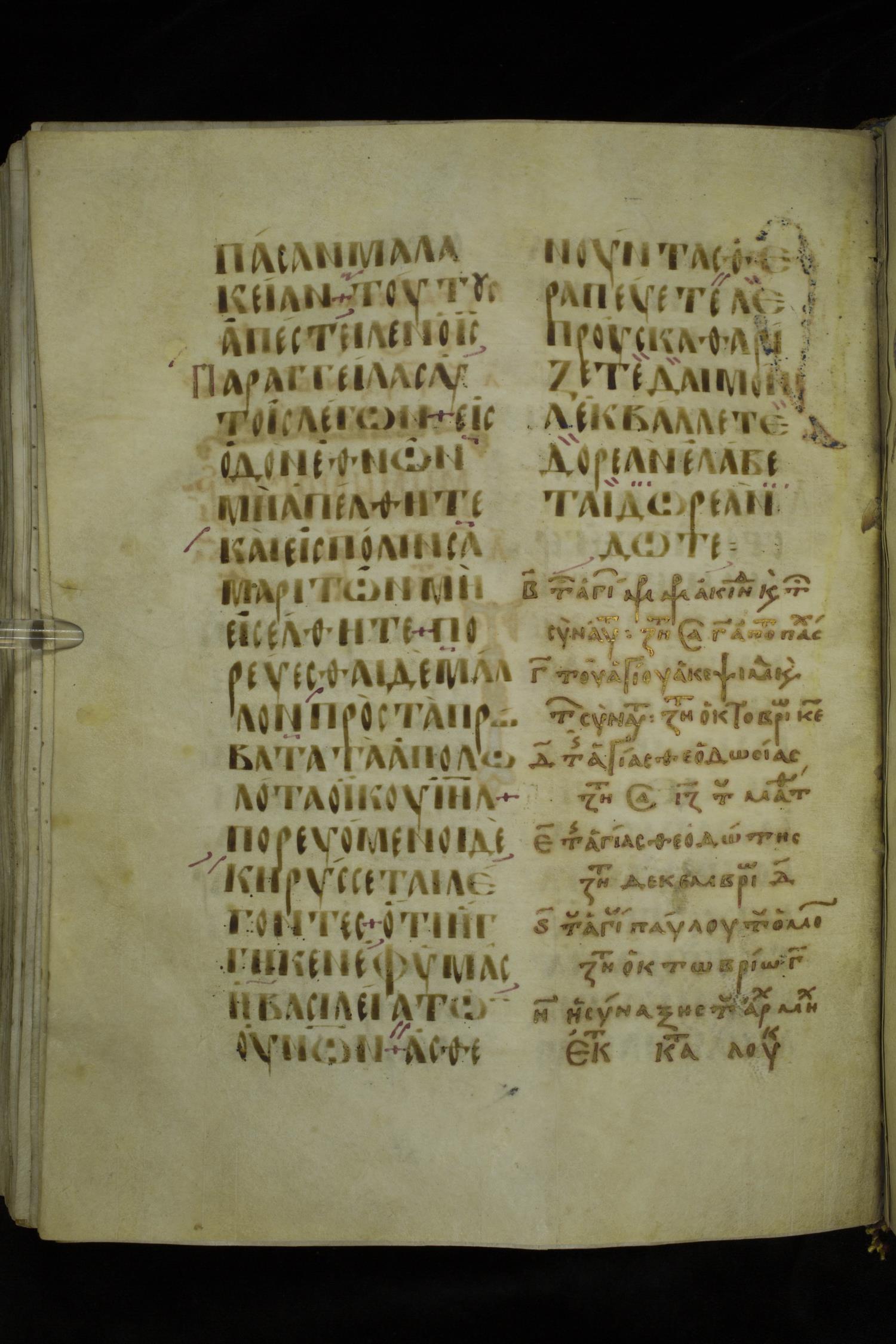 Ninth or tenth century majuscule lectionary on parchment; 273 leaves, 2 columns, 20-21 lines per column. Images were taken at the National Library of Greece in Athens.