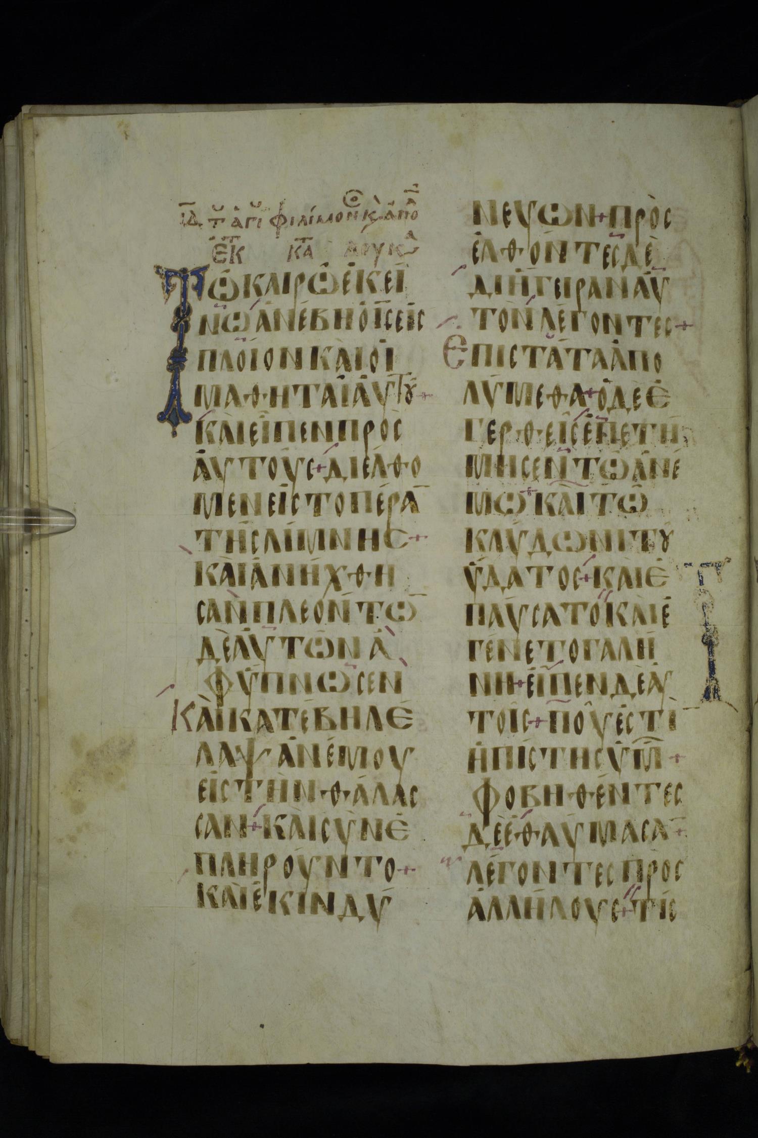 Ninth or tenth century majuscule lectionary on parchment; 273 leaves, 2 columns, 20-21 lines per column. Images were taken at the National Library of Greece in Athens.