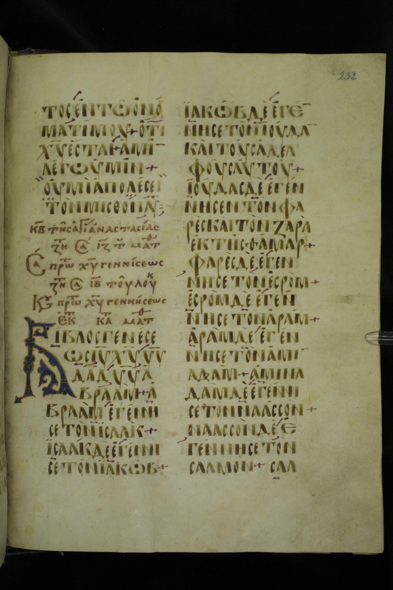 ΒΙΒΛΟΣ γενέσεως Ἰησοῦ Χριστοῦ υἱοῦ Δαυεὶδ / Δαυὶδ υἱοῦ Ἀβραάμ.