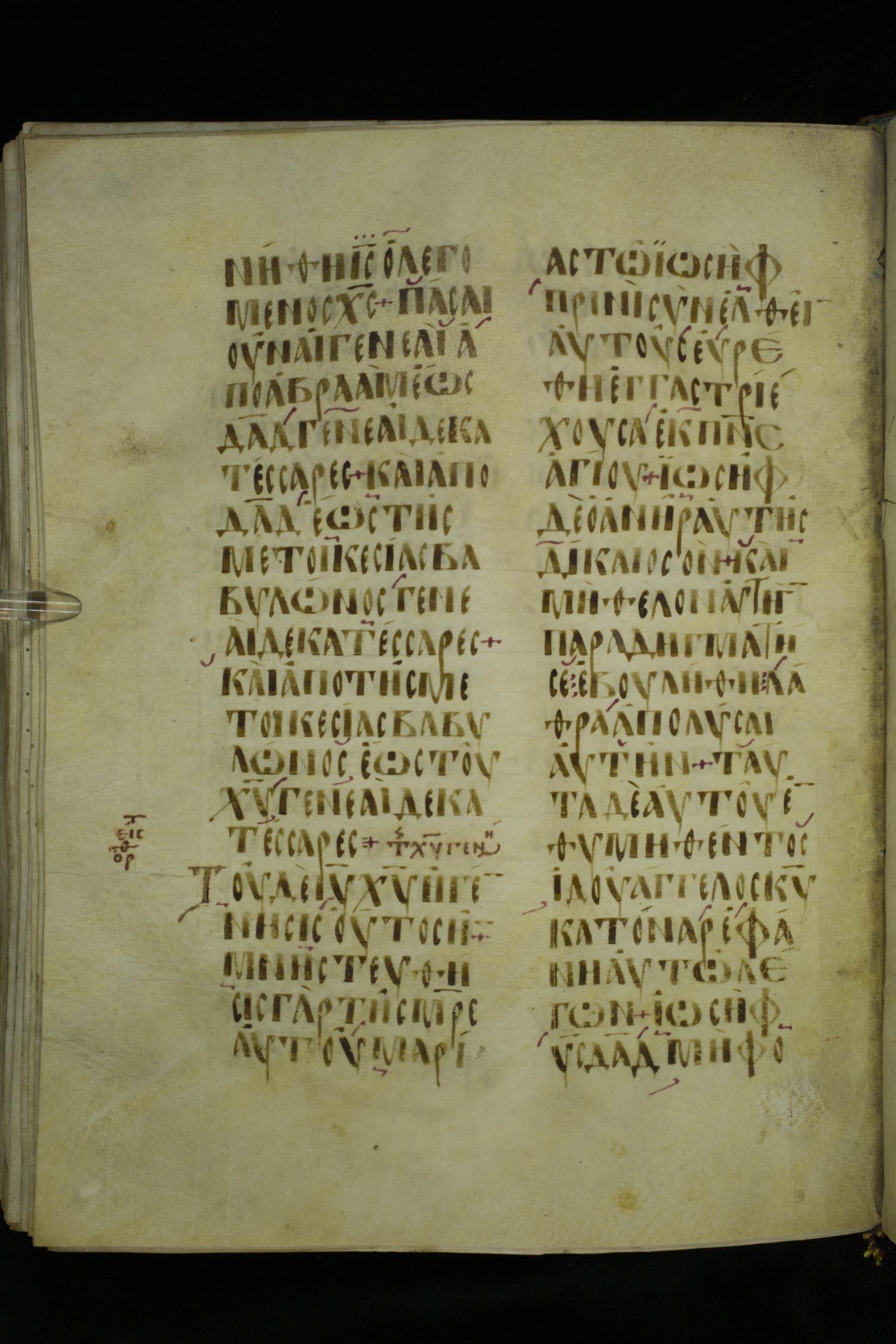 ΤΟΥ ΔΕ ΙΗΣΟΥ ΧΡΙΣΤΟΥ ἡ γένεσις οὕτως ἦν. Μνηστευθείσης τῆς μητρὸς αὐτοῦ Μαρίας τῷ Ἰωσήφ, πρὶν ἢ συνελθεῖν αὐτοὺς εὑρέθη ἐν γαστρὶ ἔχουσα ἐκ πνεύματος ἁγίου.