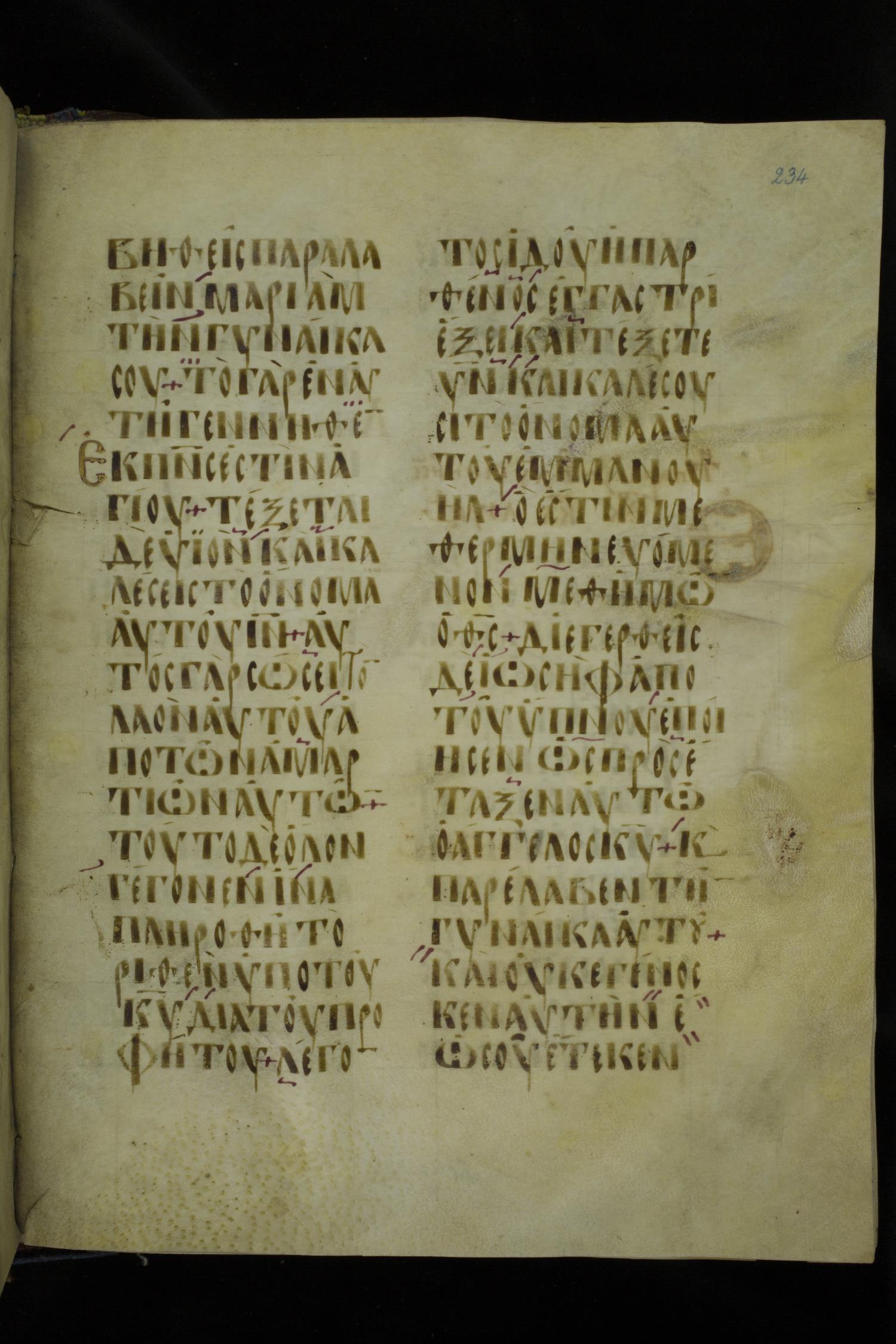 Ninth or tenth century majuscule lectionary on parchment; 273 leaves, 2 columns, 20-21 lines per column. Images were taken at the National Library of Greece in Athens.