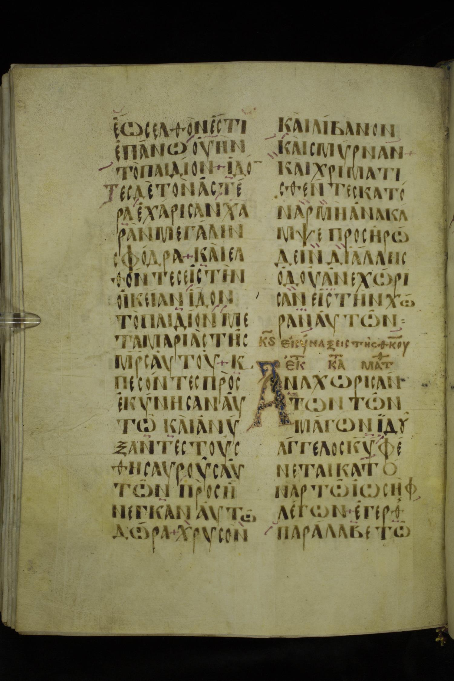 Ninth or tenth century majuscule lectionary on parchment; 273 leaves, 2 columns, 20-21 lines per column. Images were taken at the National Library of Greece in Athens.