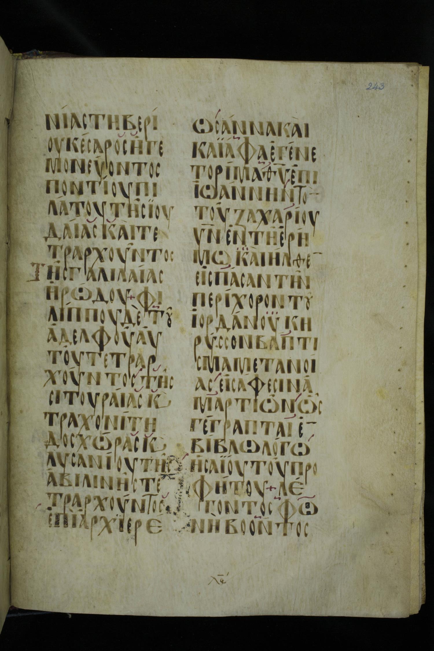 Ninth or tenth century majuscule lectionary on parchment; 273 leaves, 2 columns, 20-21 lines per column. Images were taken at the National Library of Greece in Athens.