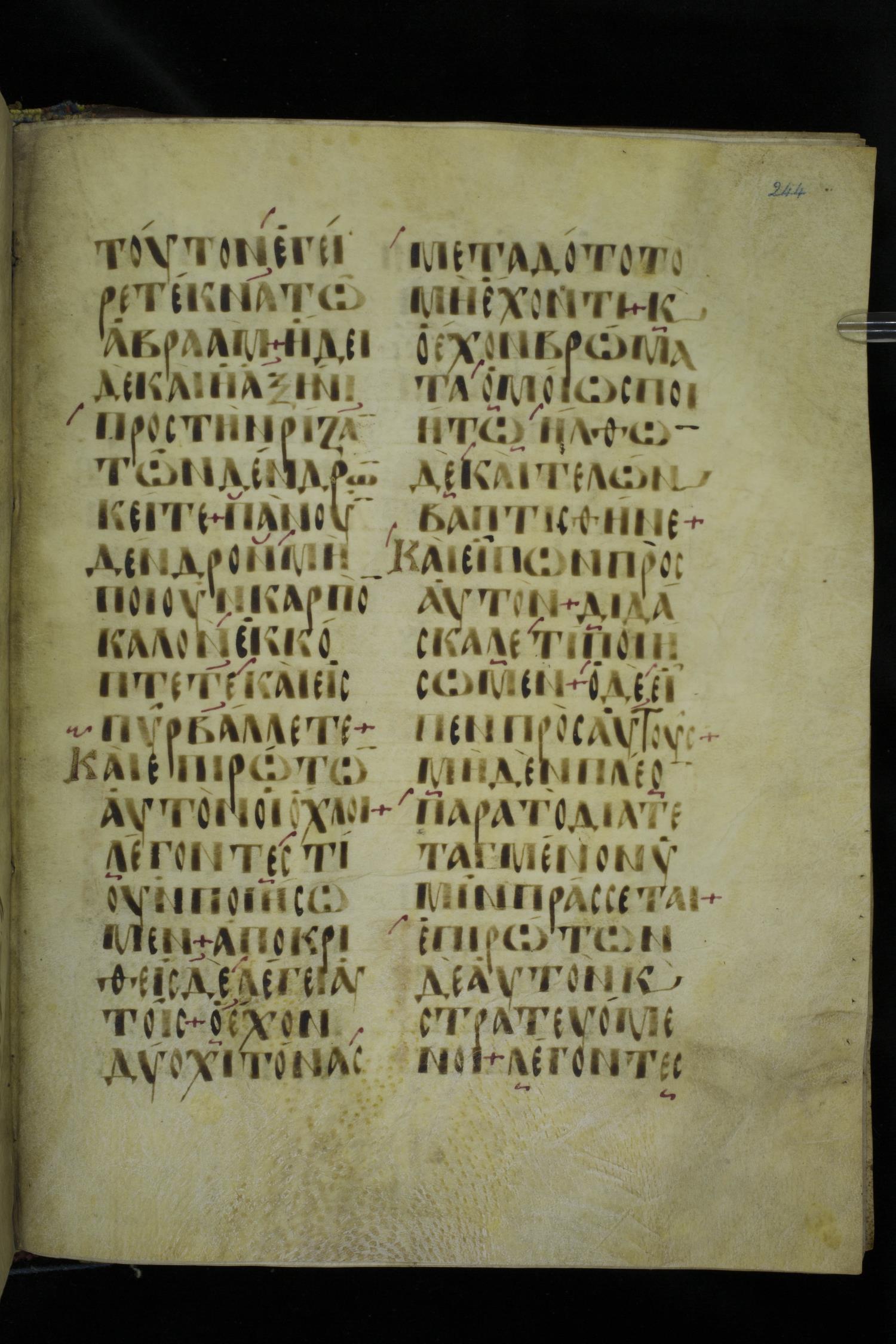 Ninth or tenth century majuscule lectionary on parchment; 273 leaves, 2 columns, 20-21 lines per column. Images were taken at the National Library of Greece in Athens.