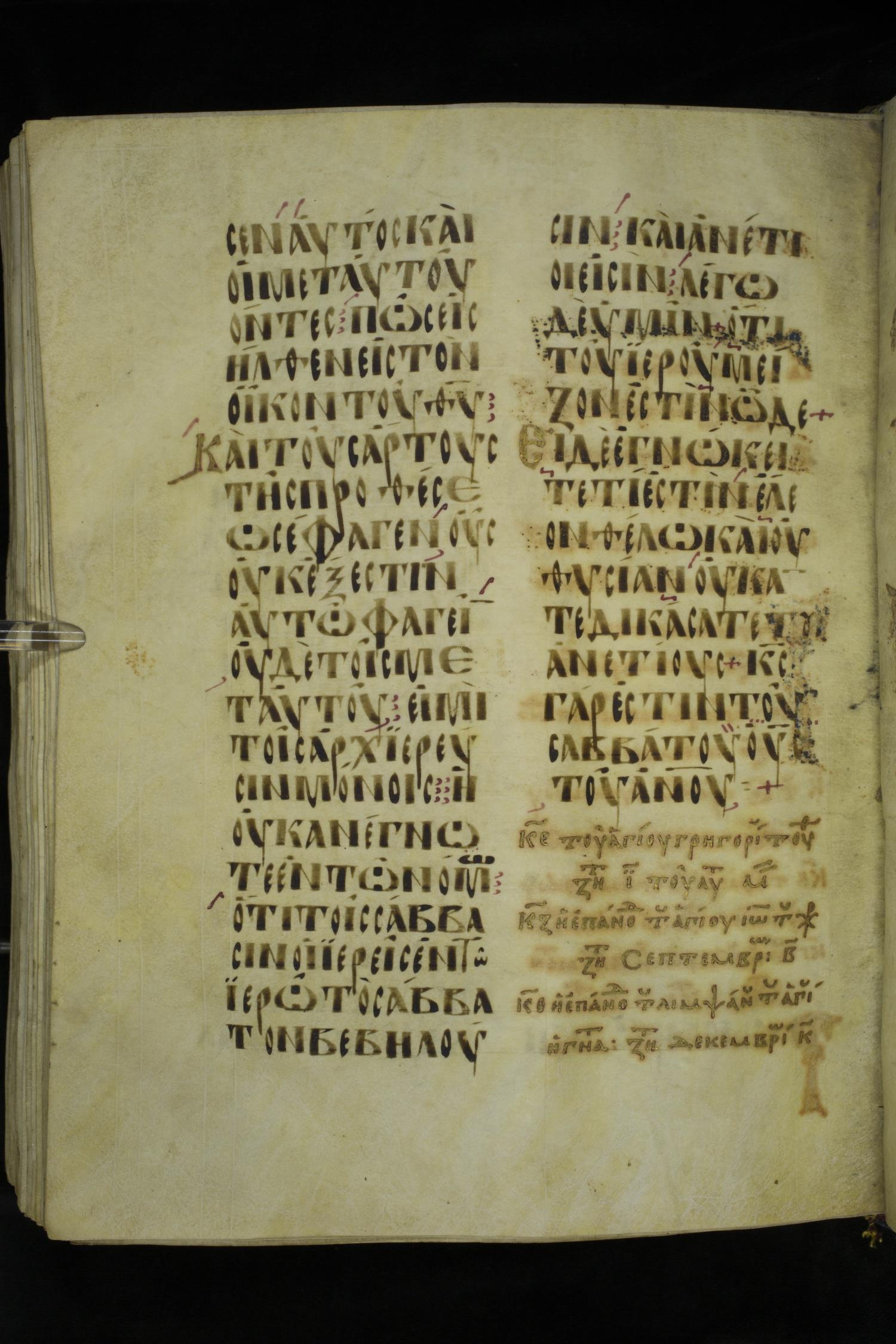 Ninth or tenth century majuscule lectionary on parchment; 273 leaves, 2 columns, 20-21 lines per column. Images were taken at the National Library of Greece in Athens.