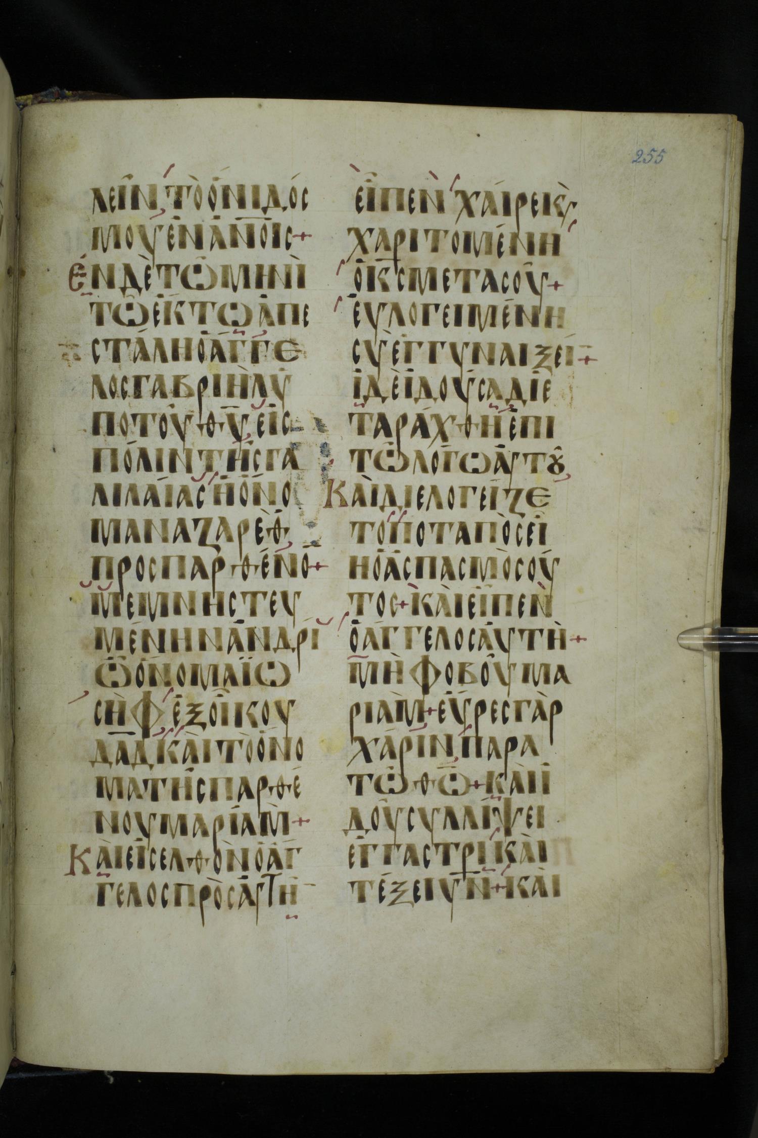 Ninth or tenth century majuscule lectionary on parchment; 273 leaves, 2 columns, 20-21 lines per column. Images were taken at the National Library of Greece in Athens.