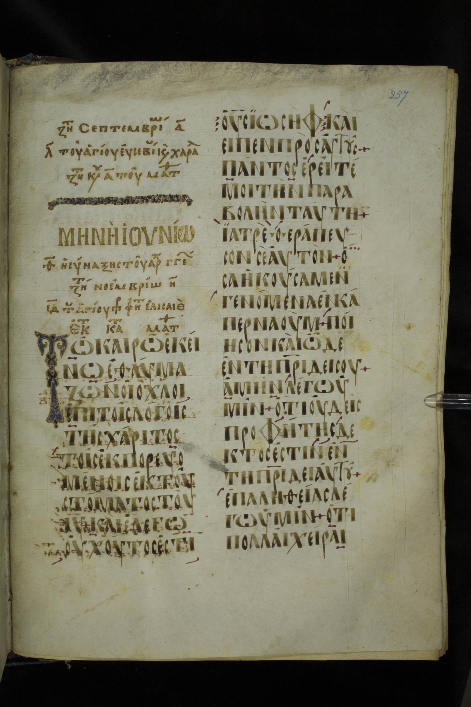 Ninth or tenth century majuscule lectionary on parchment; 273 leaves, 2 columns, 20-21 lines per column. Images were taken at the National Library of Greece in Athens.