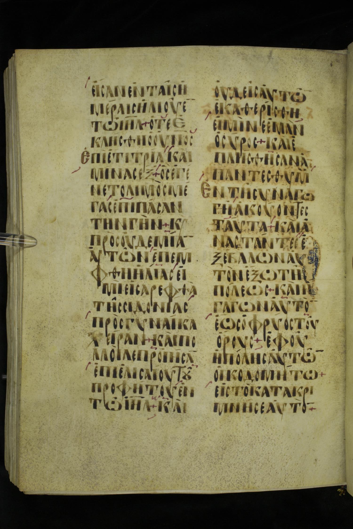 Ninth or tenth century majuscule lectionary on parchment; 273 leaves, 2 columns, 20-21 lines per column. Images were taken at the National Library of Greece in Athens.