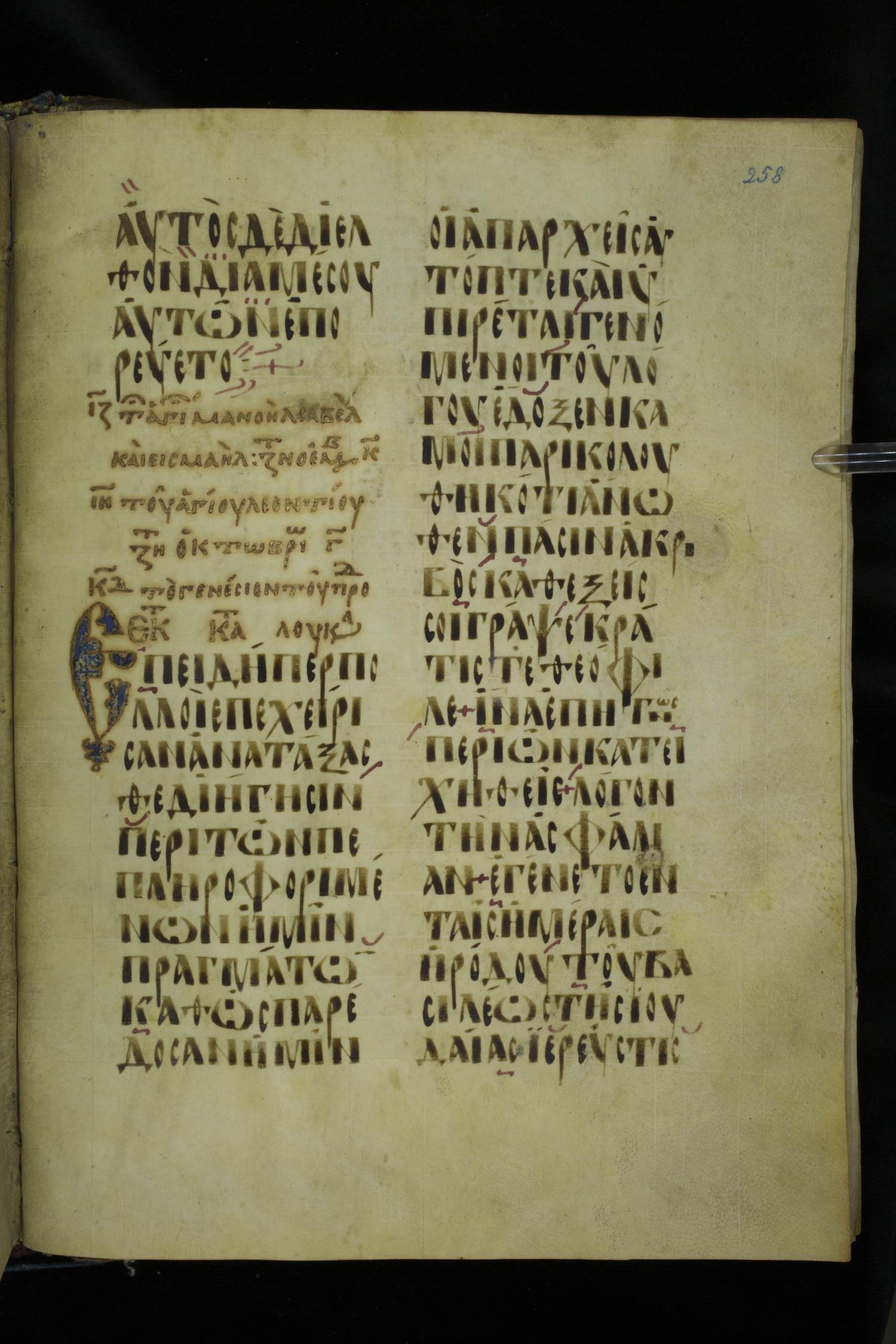Ninth or tenth century majuscule lectionary on parchment; 273 leaves, 2 columns, 20-21 lines per column. Images were taken at the National Library of Greece in Athens.