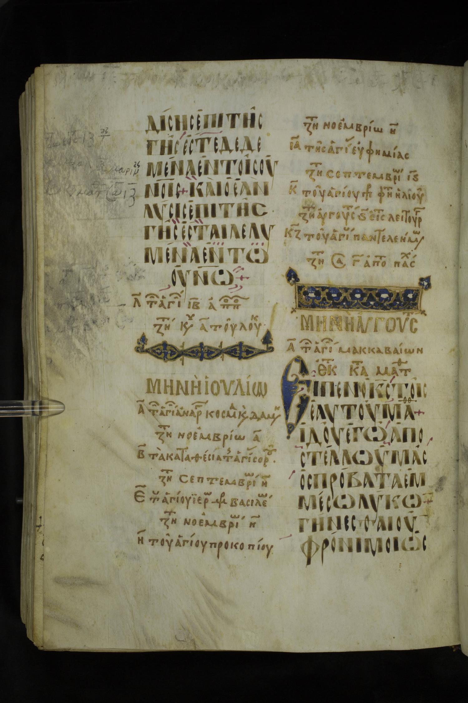 Ninth or tenth century majuscule lectionary on parchment; 273 leaves, 2 columns, 20-21 lines per column. Images were taken at the National Library of Greece in Athens.