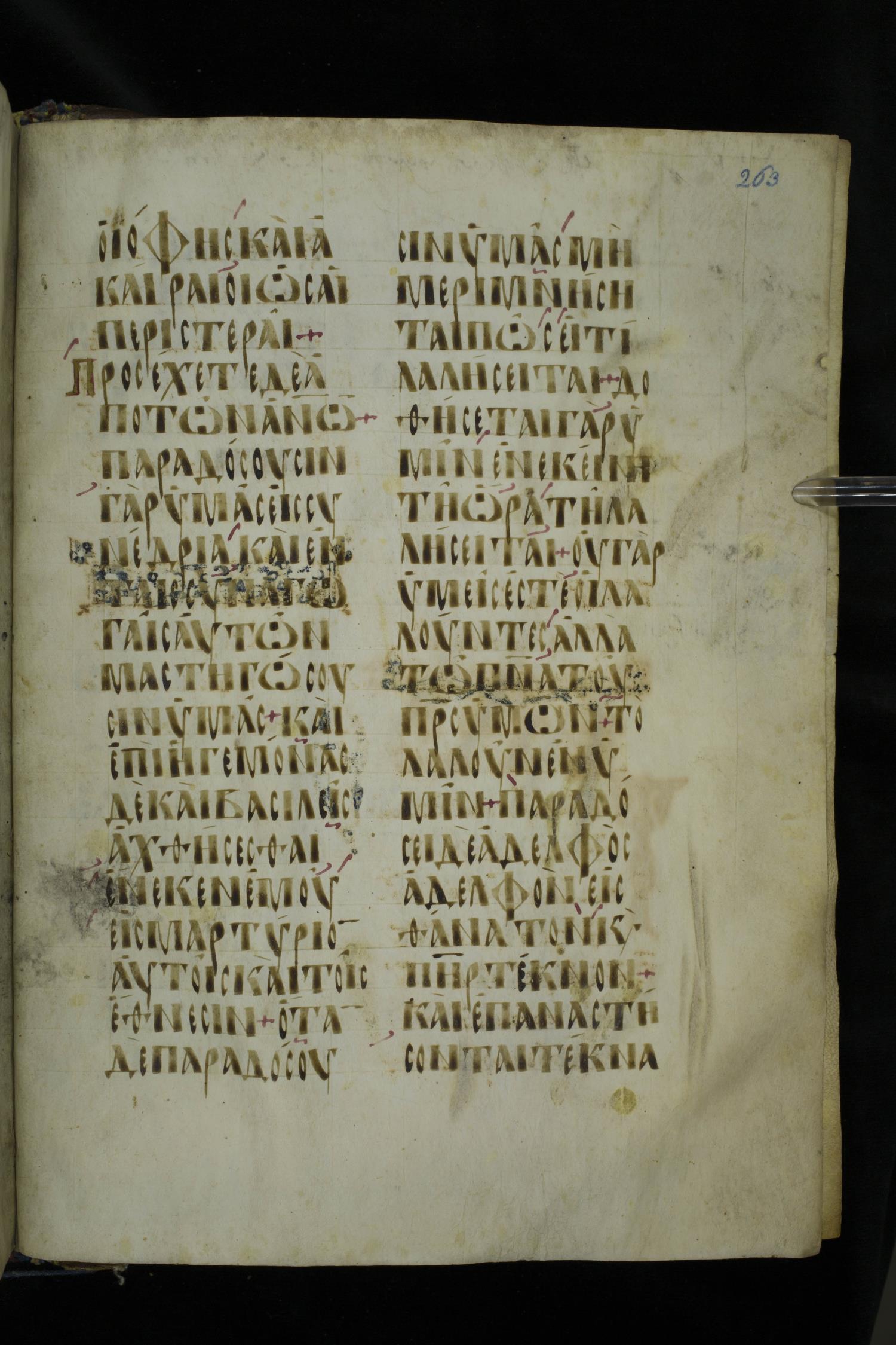 Ninth or tenth century majuscule lectionary on parchment; 273 leaves, 2 columns, 20-21 lines per column. Images were taken at the National Library of Greece in Athens.