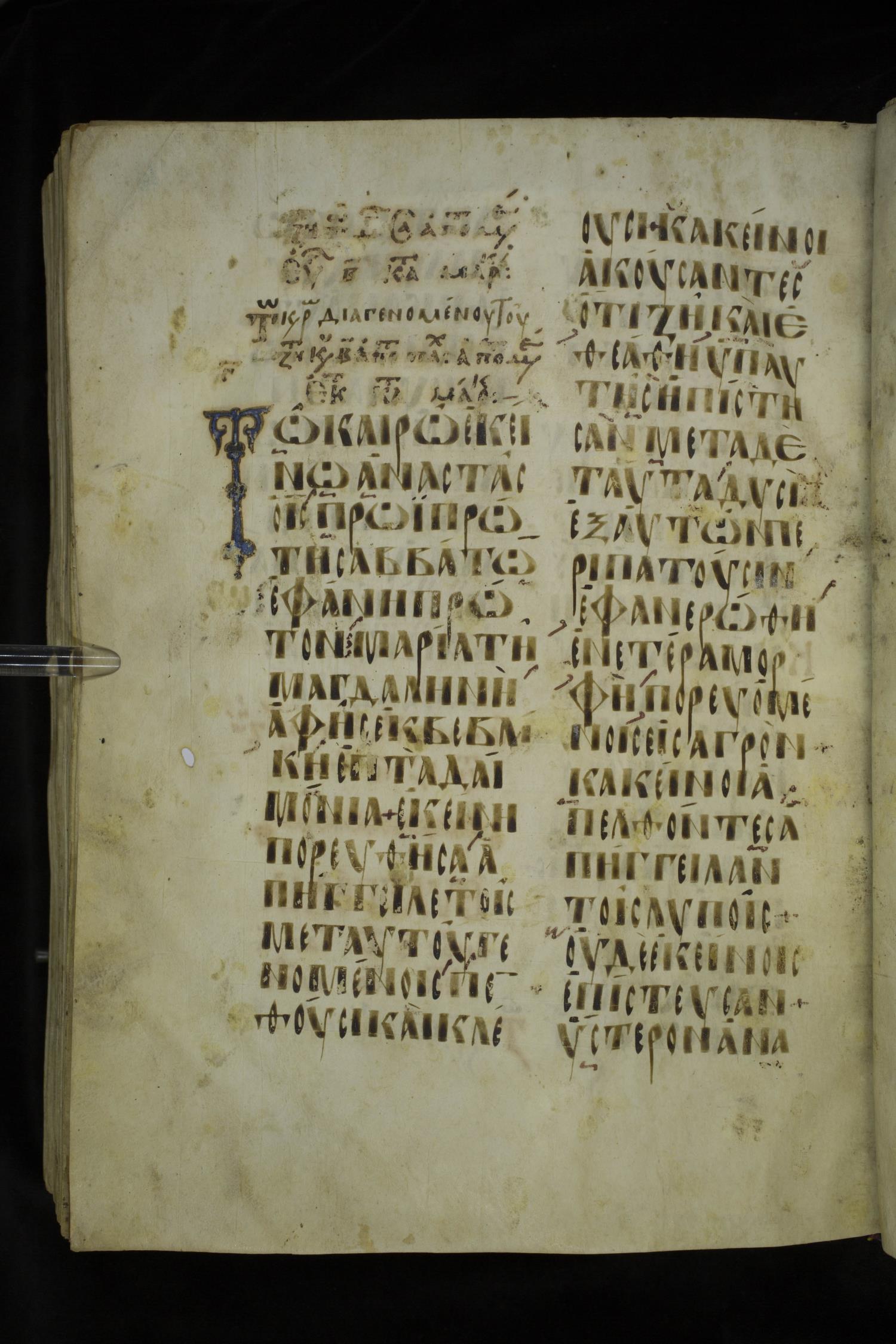 Ninth or tenth century majuscule lectionary on parchment; 273 leaves, 2 columns, 20-21 lines per column. Images were taken at the National Library of Greece in Athens.