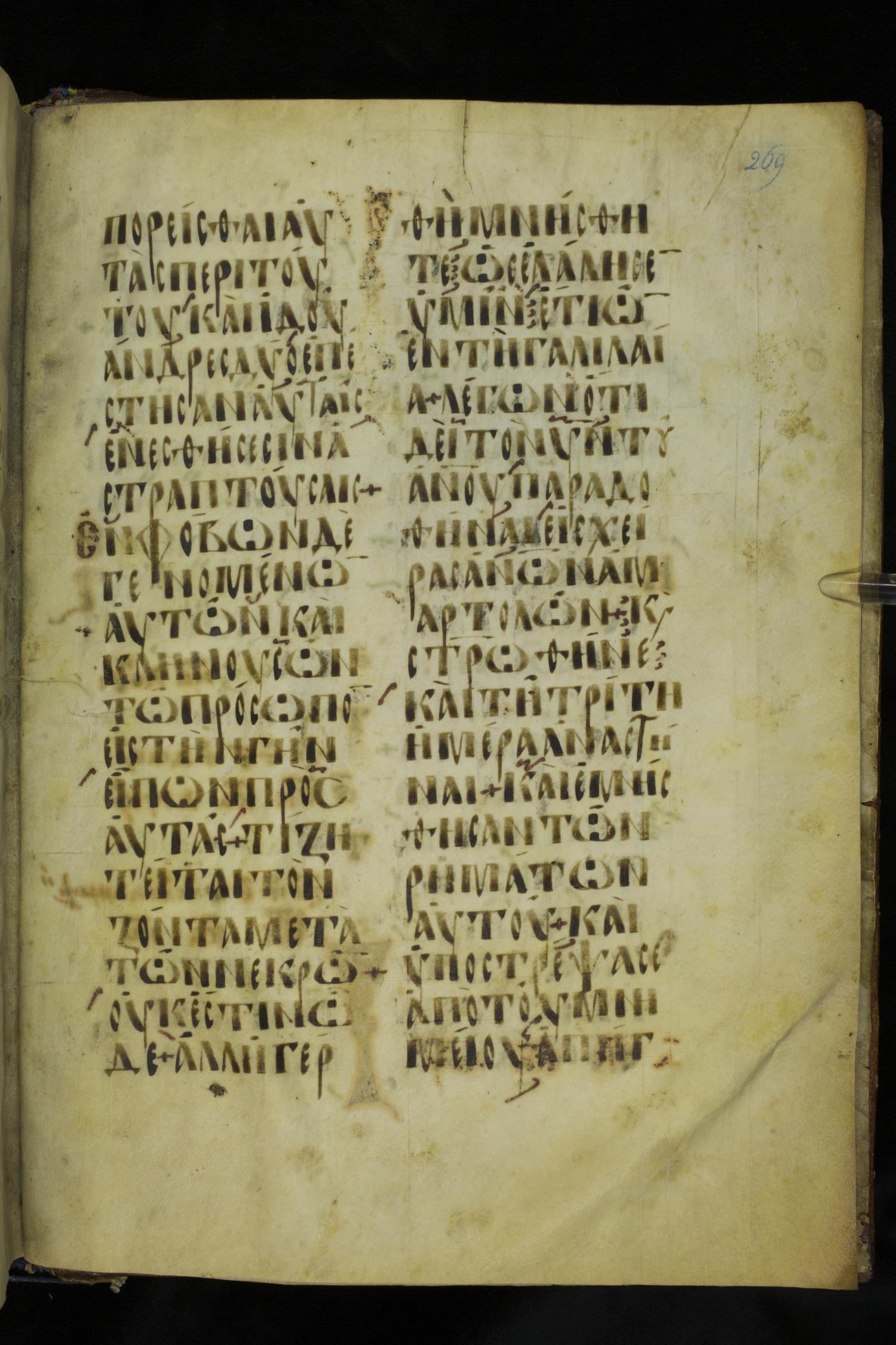 Ninth or tenth century majuscule lectionary on parchment; 273 leaves, 2 columns, 20-21 lines per column. Images were taken at the National Library of Greece in Athens.