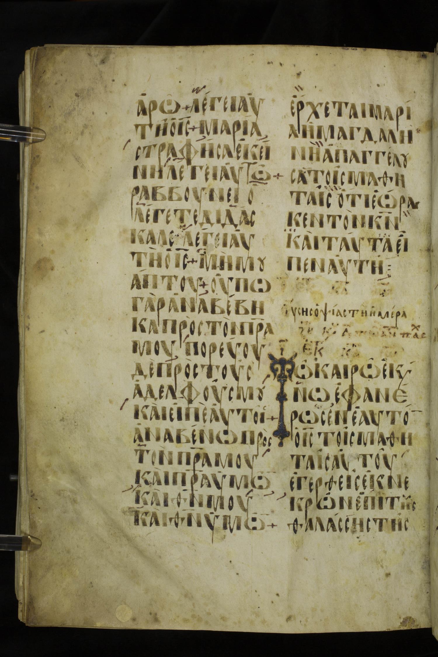 Ninth or tenth century majuscule lectionary on parchment; 273 leaves, 2 columns, 20-21 lines per column. Images were taken at the National Library of Greece in Athens.