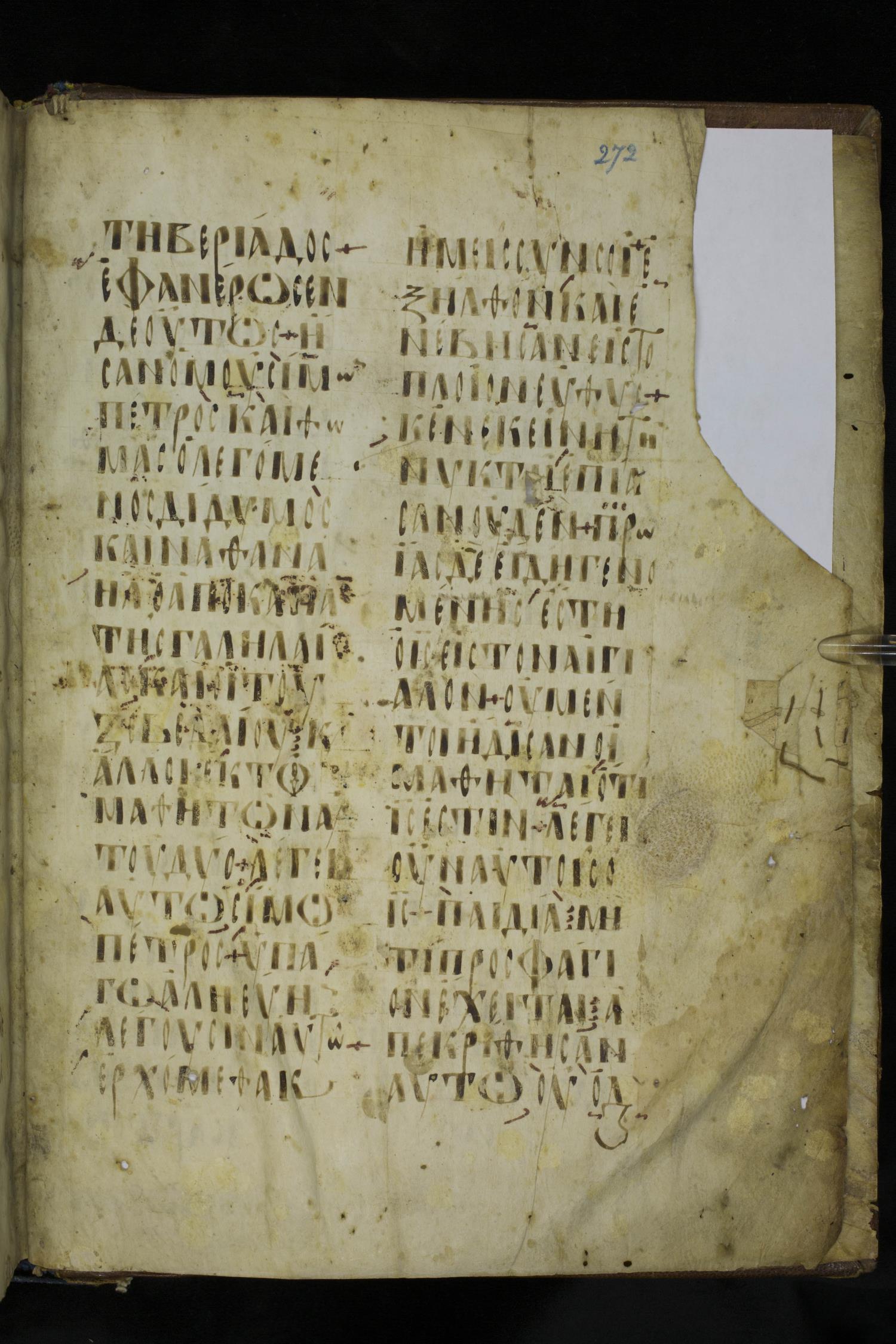 Ninth or tenth century majuscule lectionary on parchment; 273 leaves, 2 columns, 20-21 lines per column. Images were taken at the National Library of Greece in Athens.