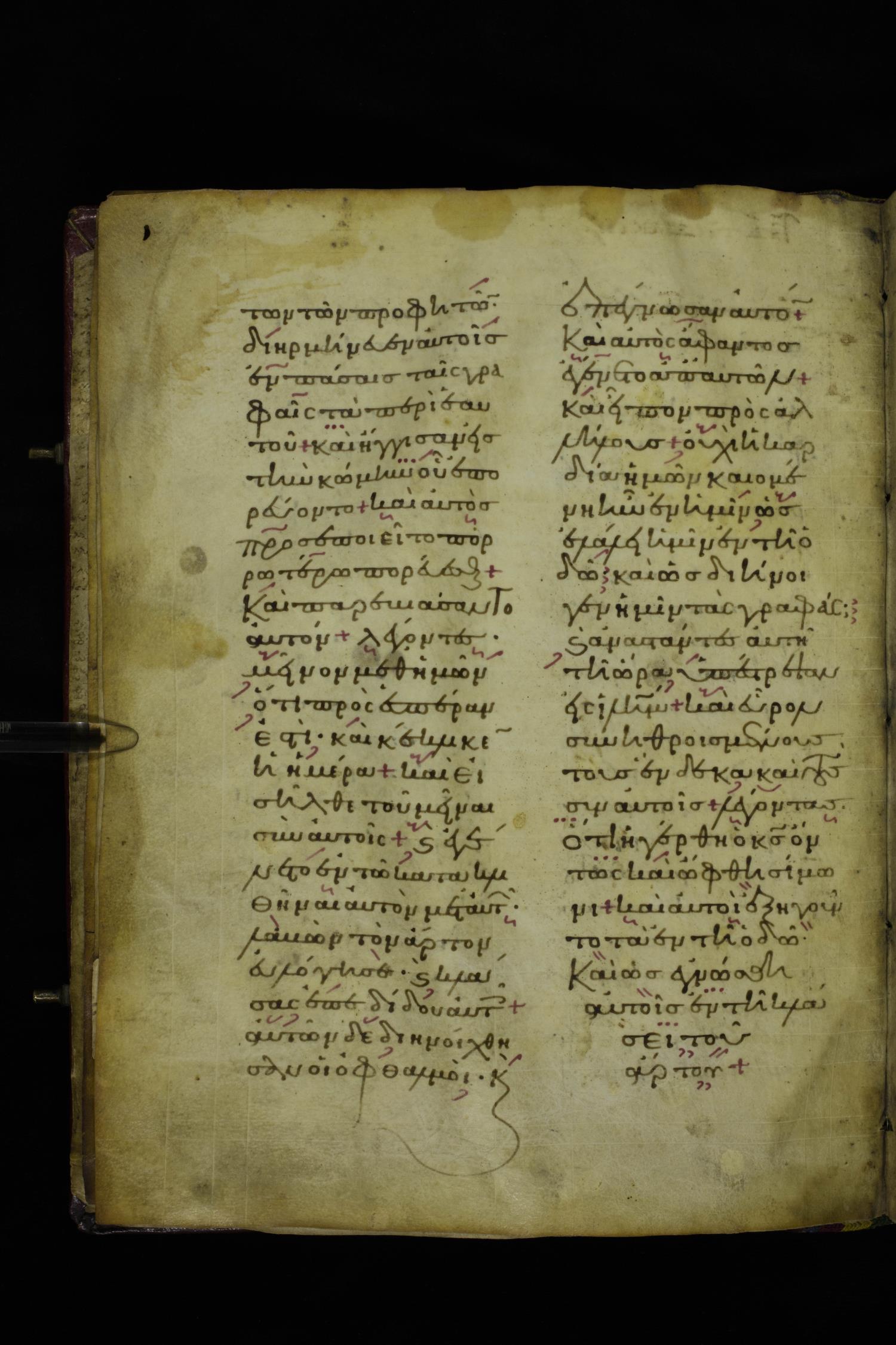 Twelfth century lectionary of the Gospels on parchment; 220 leaves, 2 columns, 24 lines per column. Images were taken at the National Library of Greece in Athens.