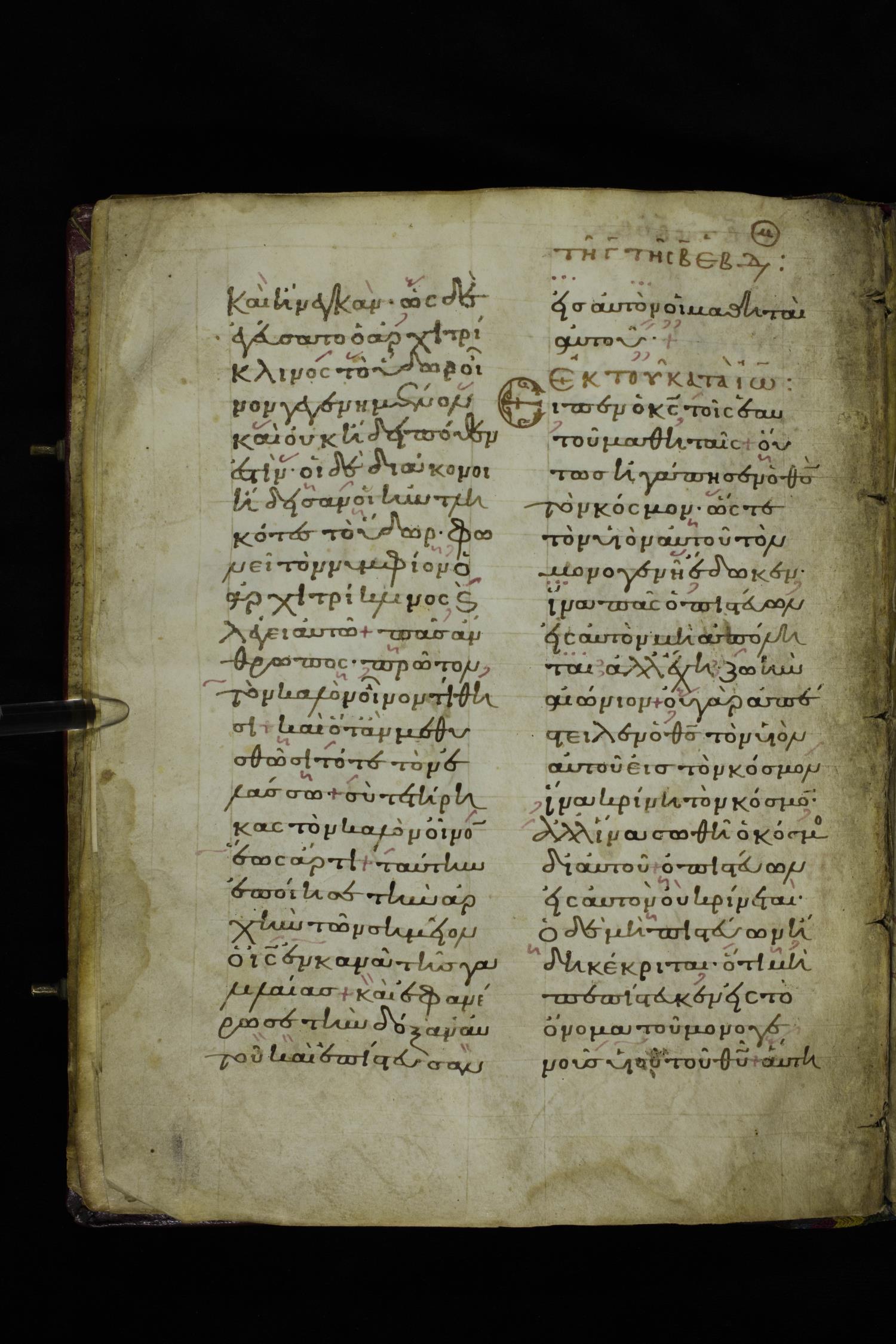 Twelfth century lectionary of the Gospels on parchment; 220 leaves, 2 columns, 24 lines per column. Images were taken at the National Library of Greece in Athens.