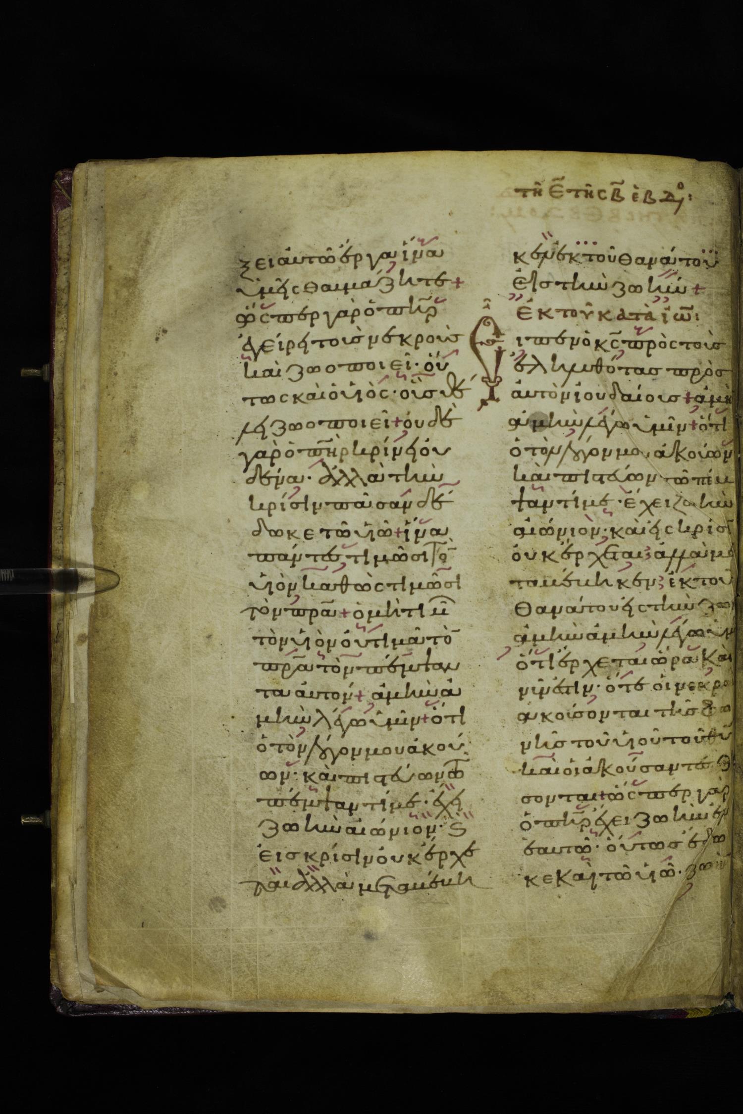 Twelfth century lectionary of the Gospels on parchment; 220 leaves, 2 columns, 24 lines per column. Images were taken at the National Library of Greece in Athens.