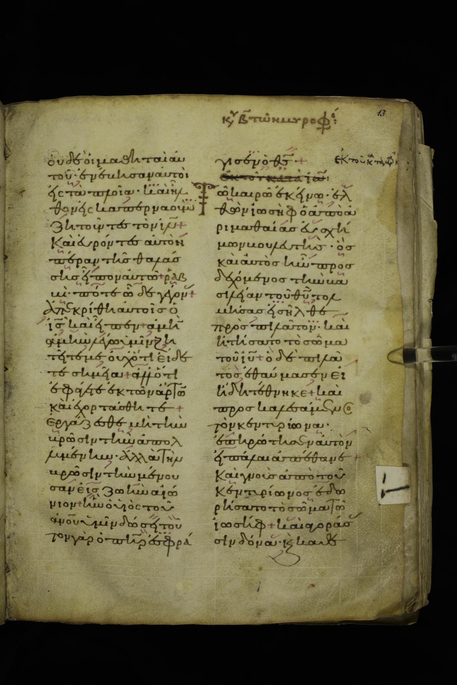 Twelfth century lectionary of the Gospels on parchment; 220 leaves, 2 columns, 24 lines per column. Images were taken at the National Library of Greece in Athens.