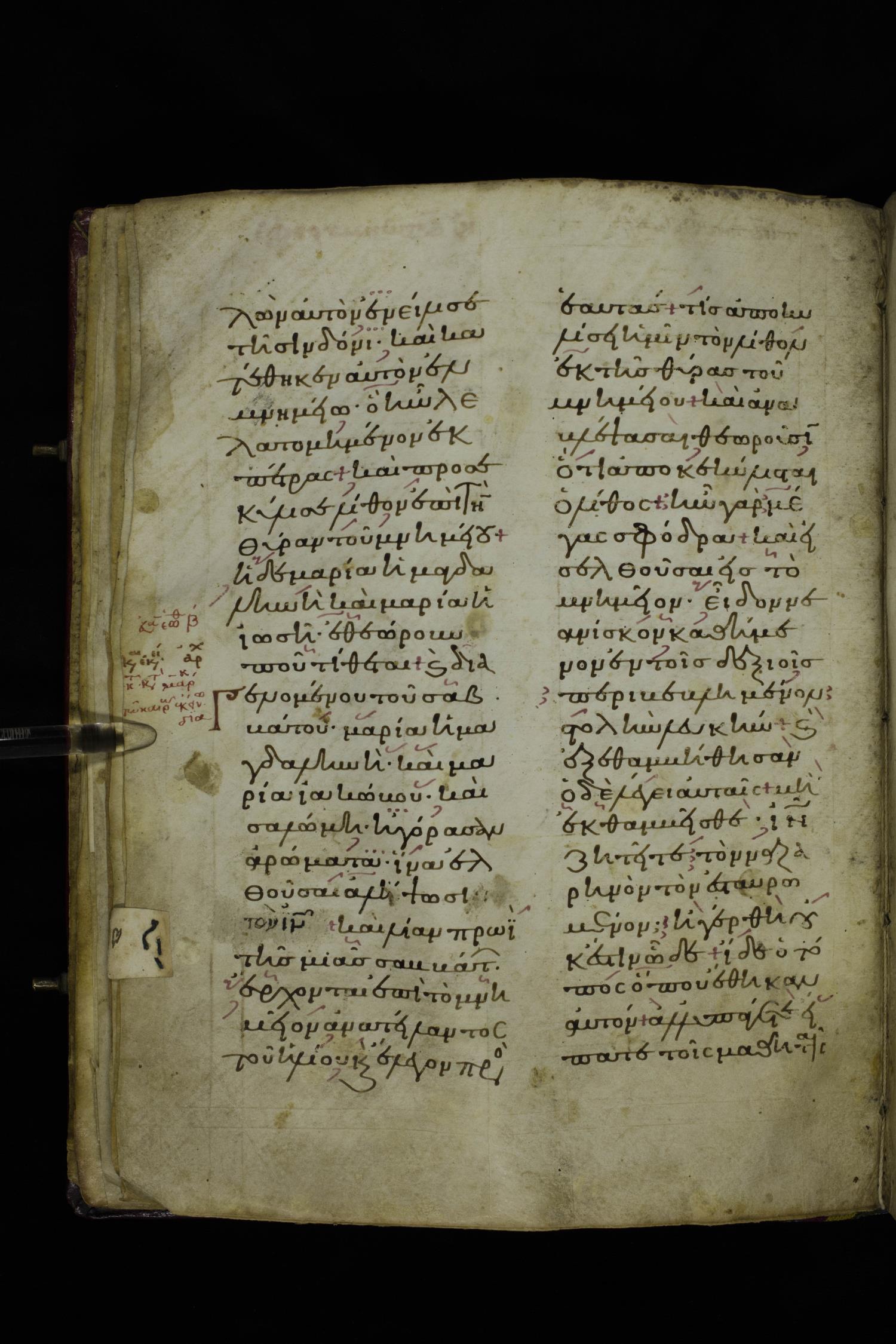 Twelfth century lectionary of the Gospels on parchment; 220 leaves, 2 columns, 24 lines per column. Images were taken at the National Library of Greece in Athens.