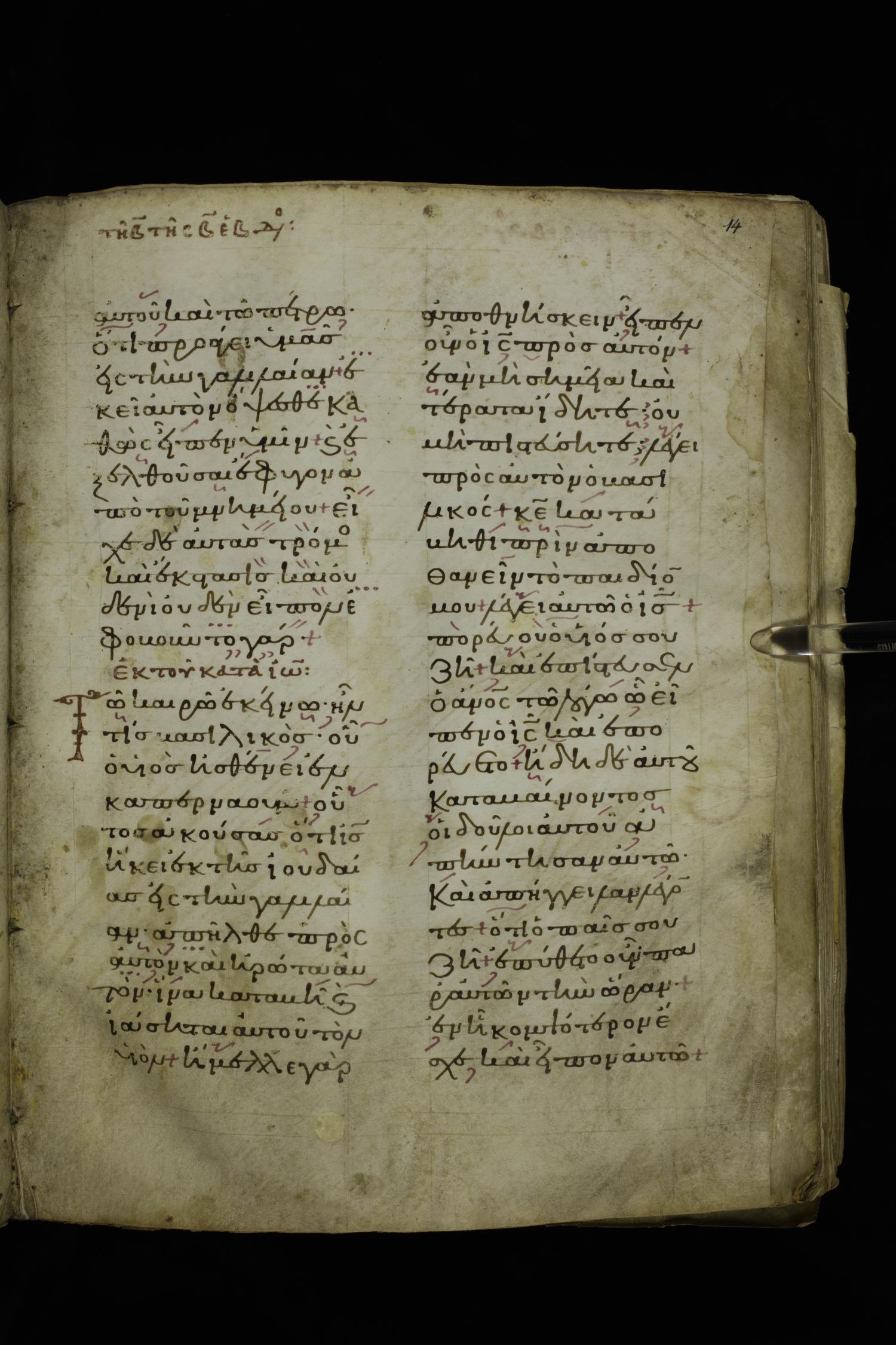 Twelfth century lectionary of the Gospels on parchment; 220 leaves, 2 columns, 24 lines per column. Images were taken at the National Library of Greece in Athens.