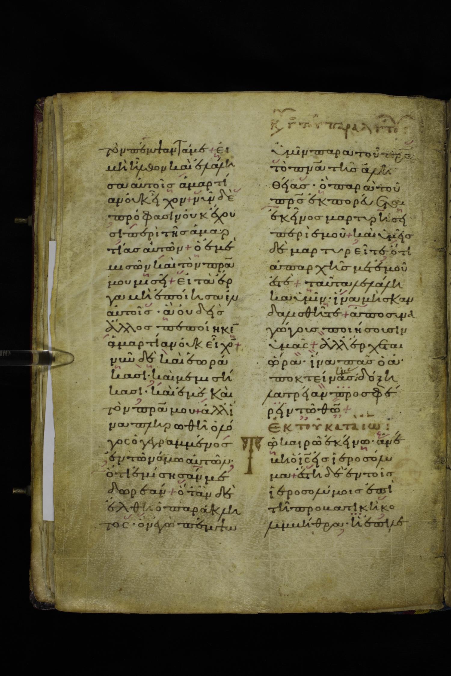 Twelfth century lectionary of the Gospels on parchment; 220 leaves, 2 columns, 24 lines per column. Images were taken at the National Library of Greece in Athens.