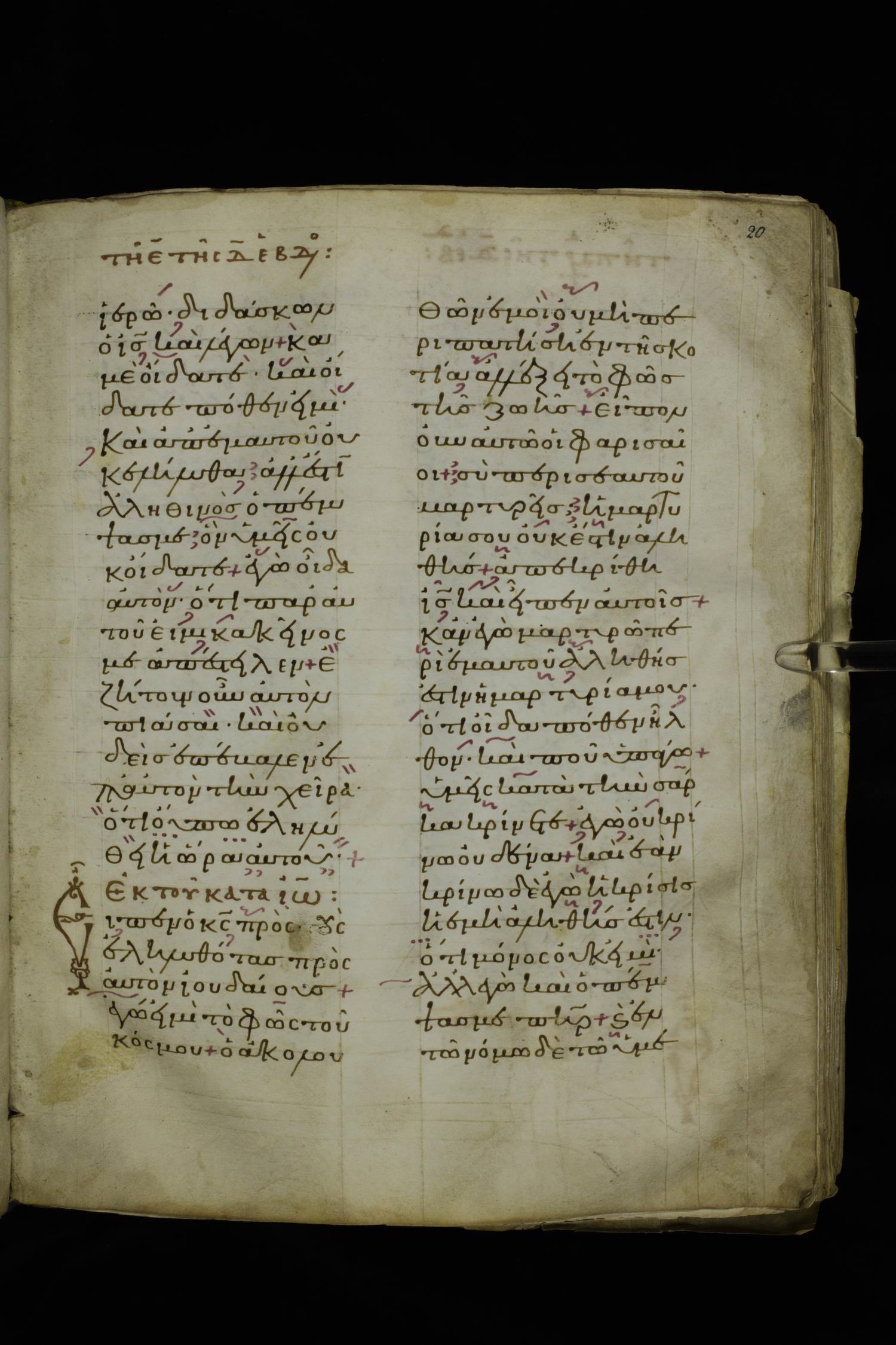 Twelfth century lectionary of the Gospels on parchment; 220 leaves, 2 columns, 24 lines per column. Images were taken at the National Library of Greece in Athens.