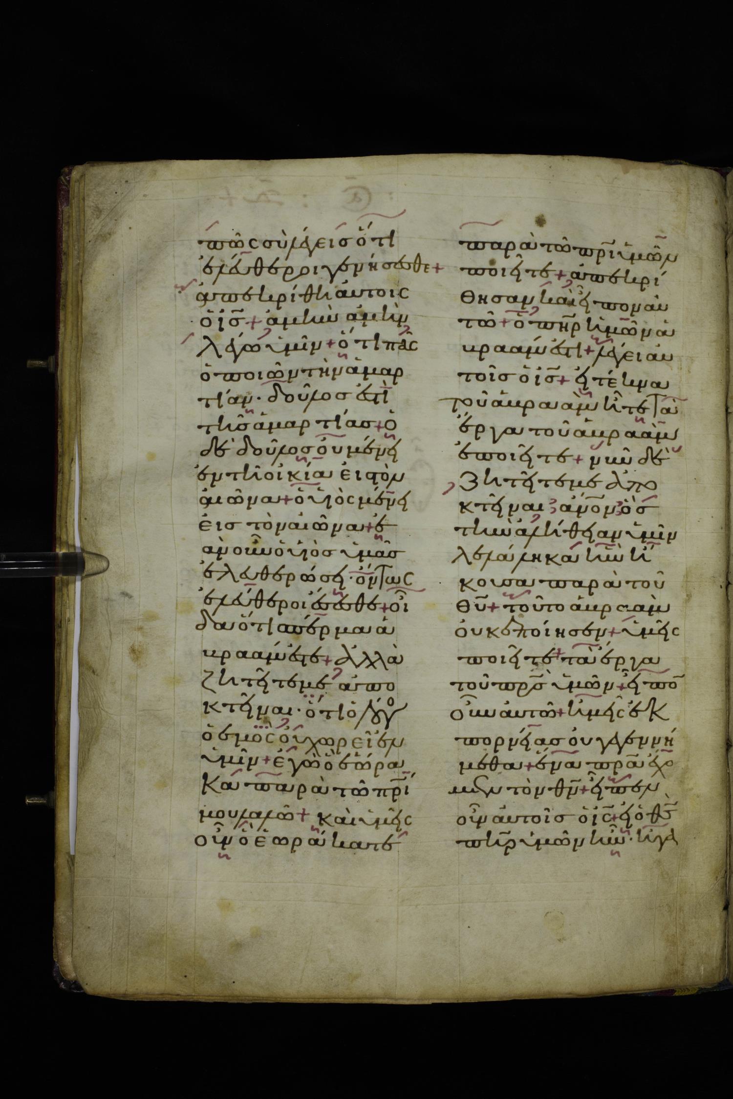 Twelfth century lectionary of the Gospels on parchment; 220 leaves, 2 columns, 24 lines per column. Images were taken at the National Library of Greece in Athens.