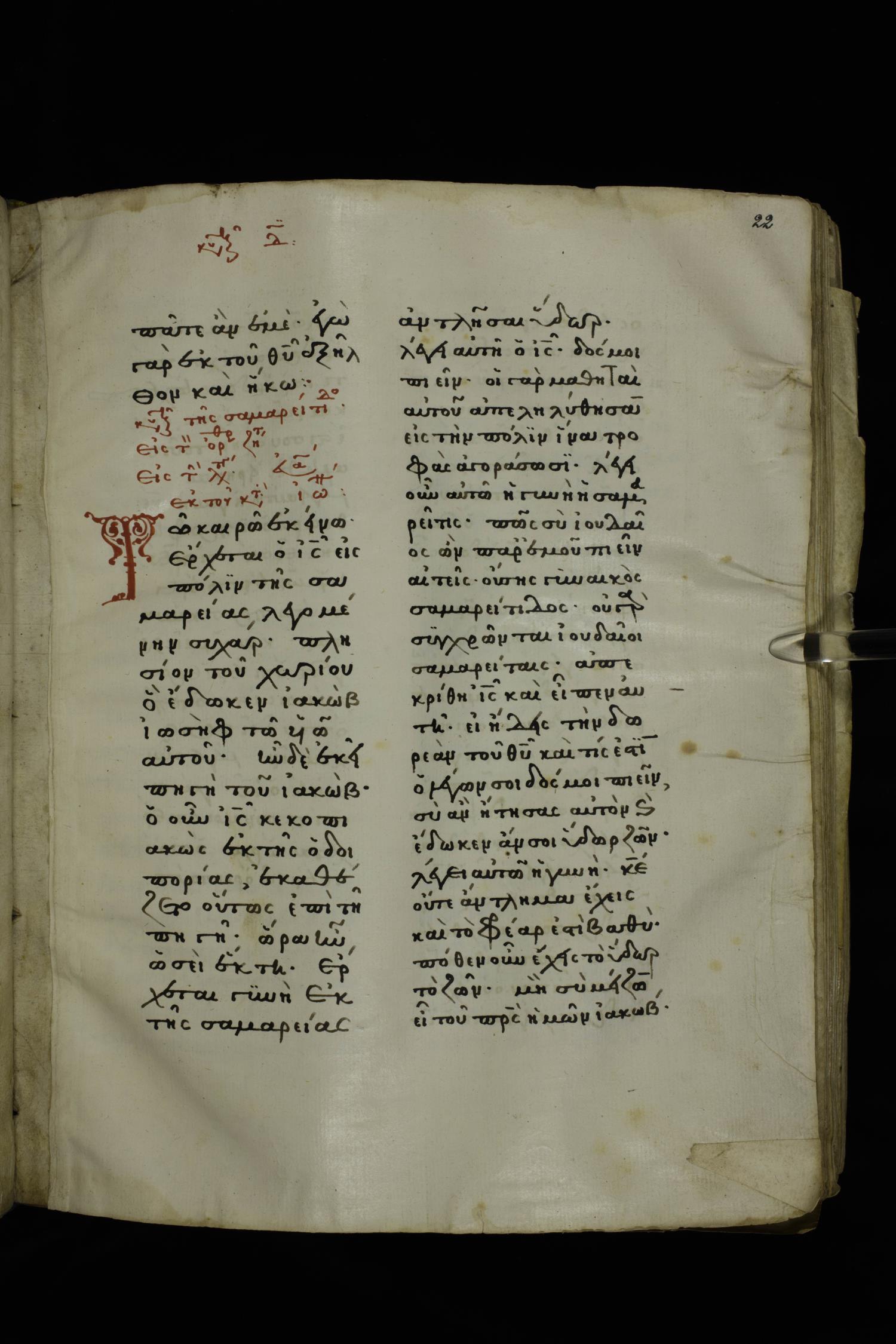 Twelfth century lectionary of the Gospels on parchment; 220 leaves, 2 columns, 24 lines per column. Images were taken at the National Library of Greece in Athens.