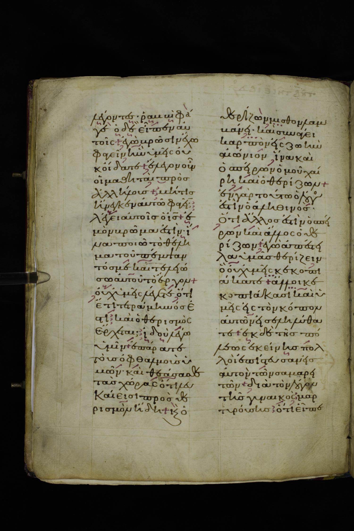 Twelfth century lectionary of the Gospels on parchment; 220 leaves, 2 columns, 24 lines per column. Images were taken at the National Library of Greece in Athens.