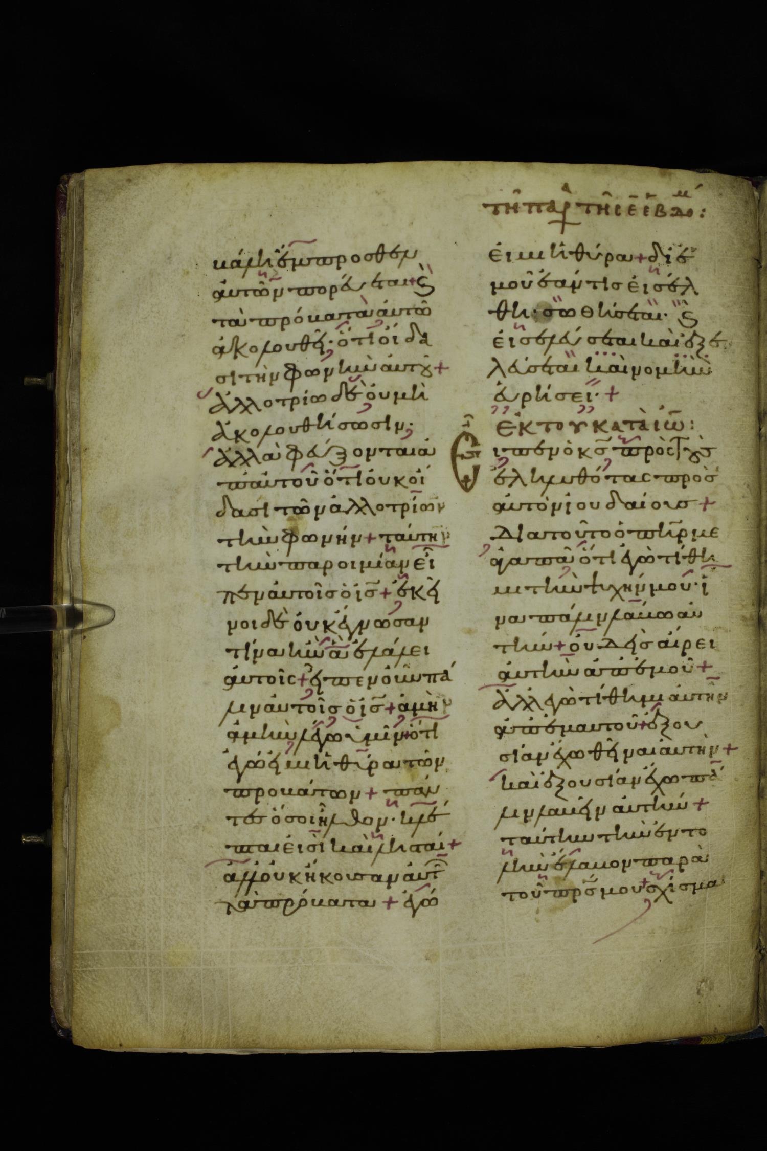Twelfth century lectionary of the Gospels on parchment; 220 leaves, 2 columns, 24 lines per column. Images were taken at the National Library of Greece in Athens.