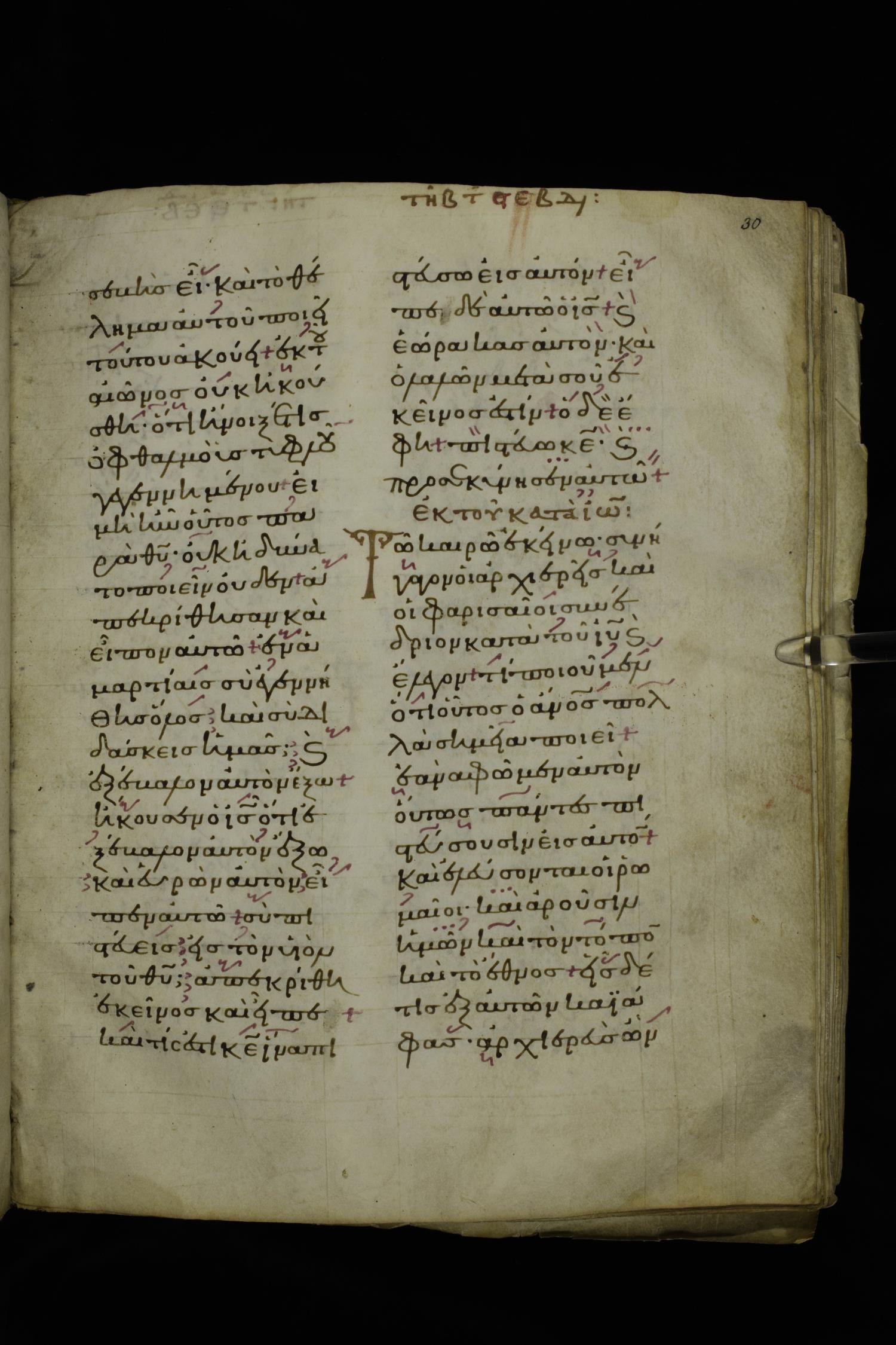 Twelfth century lectionary of the Gospels on parchment; 220 leaves, 2 columns, 24 lines per column. Images were taken at the National Library of Greece in Athens.