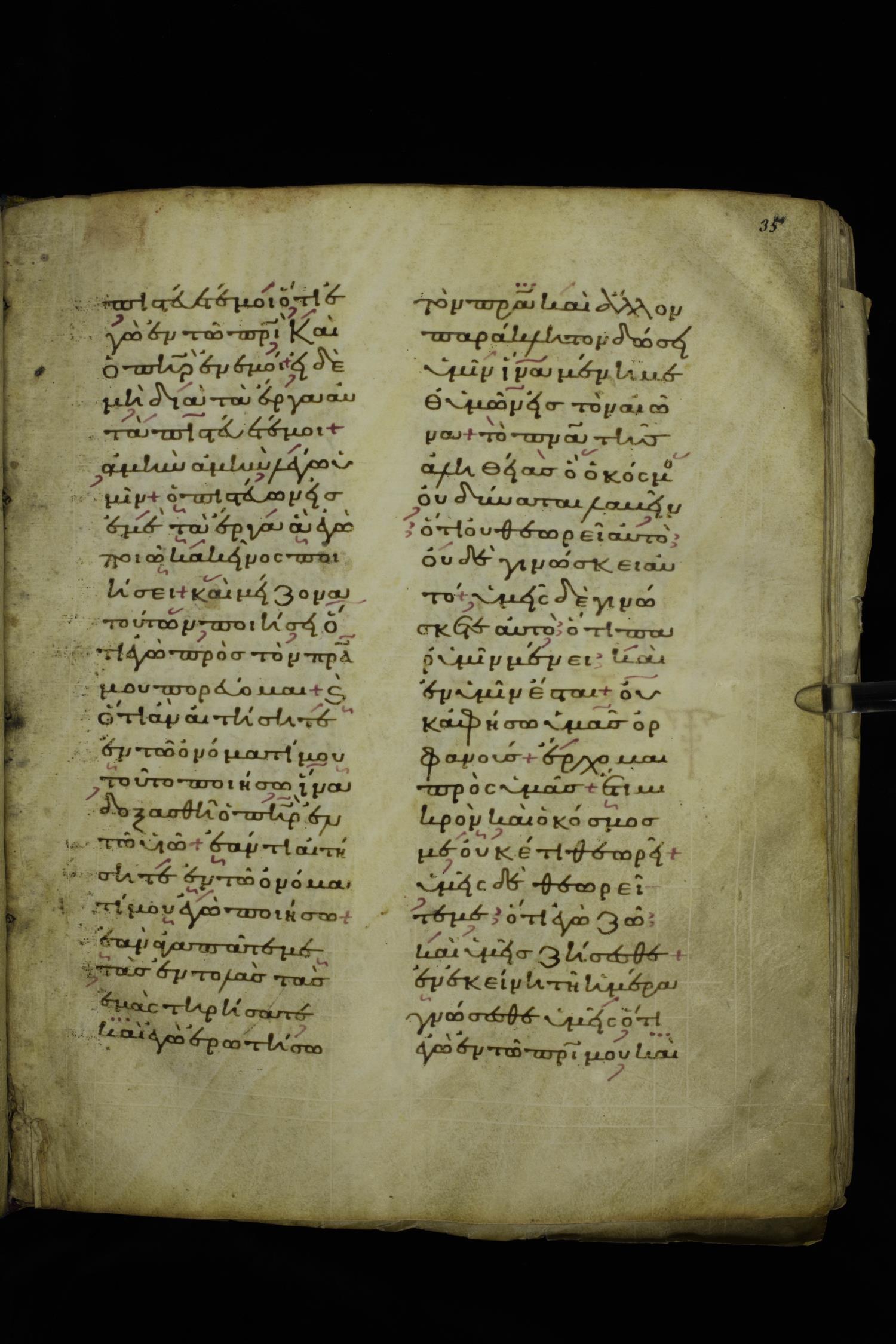 Twelfth century lectionary of the Gospels on parchment; 220 leaves, 2 columns, 24 lines per column. Images were taken at the National Library of Greece in Athens.